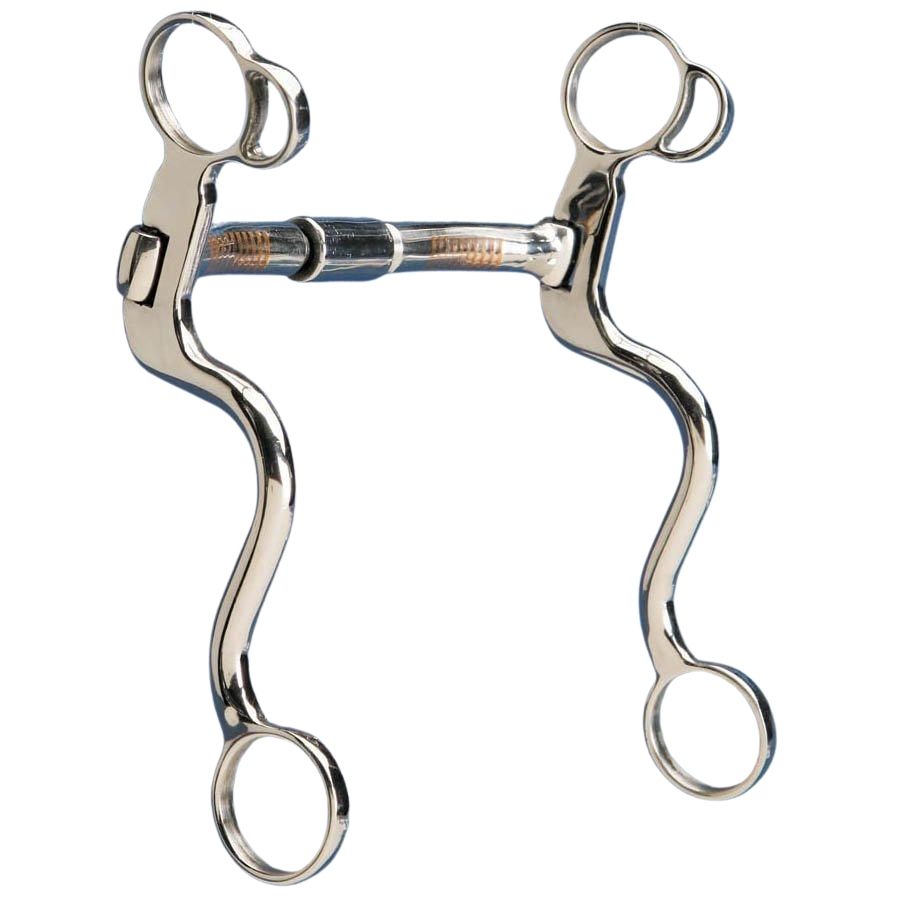 A roller bit with patented brushed steel "Never Tarnish" finish w/ 7 1/2" cheek 5" snaffle mouth with a copper roller. The copper roller helps calm and\ keep the mouth moist. It has low to moderate leverage.