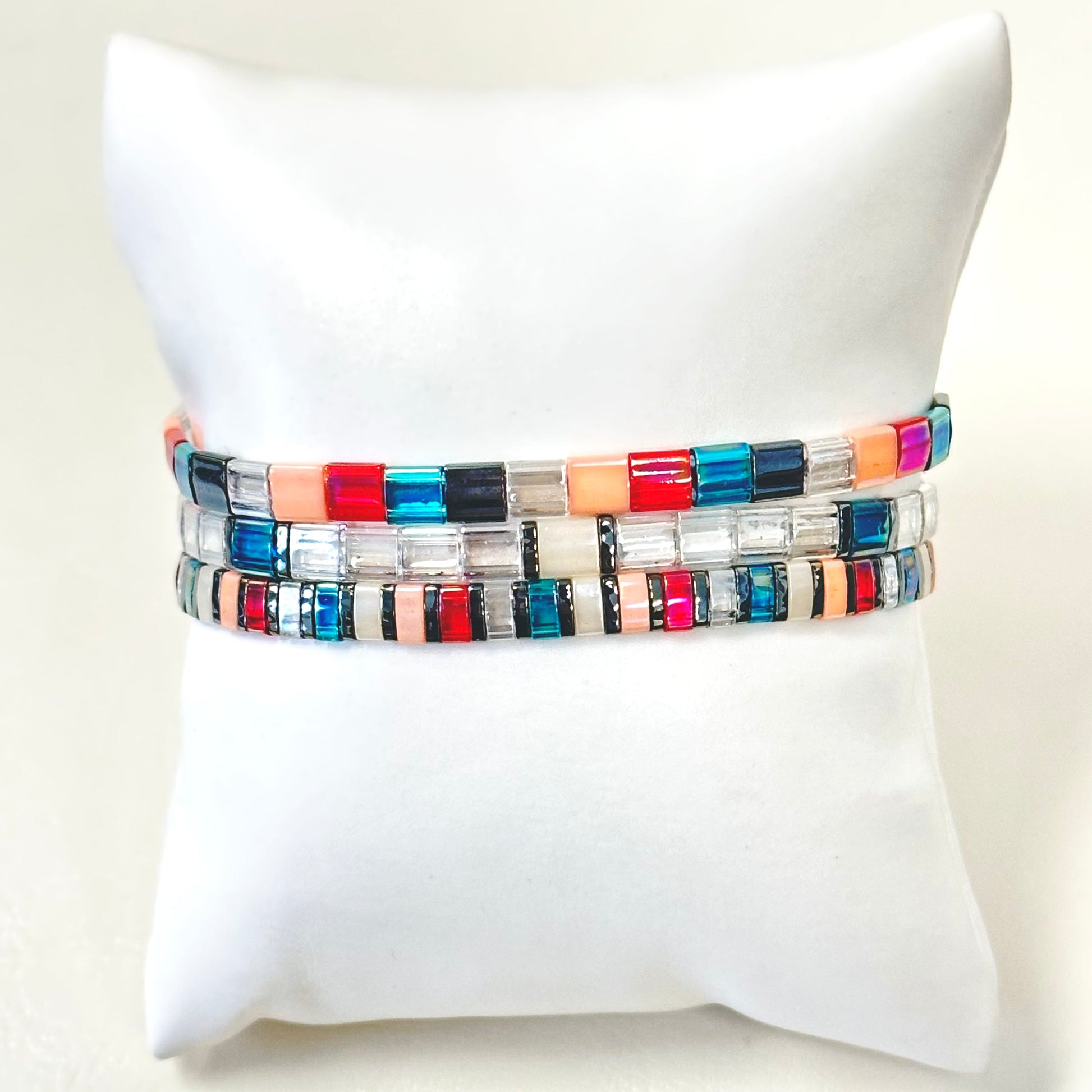 Our SOIRÉE stack includes three total bracelets! (Yes, 3!!) Included in the stack are 3 tila bracelets with gorgeous colors of Teal, Gunmetal, Red, Coral, and Vanilla.