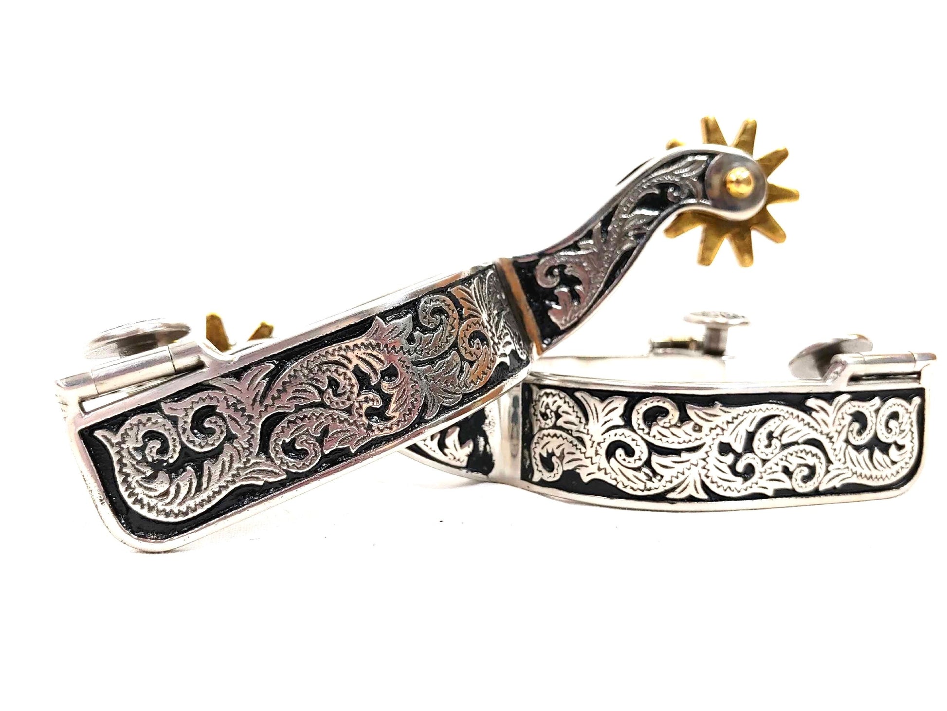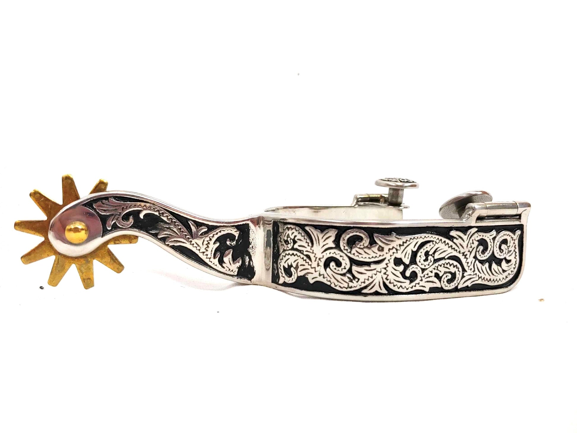 The Night Hawk combines the new and the old into a great looking spur. Stainless steel spurs that have a Colorado blue background withpolished stainless steel etching. 1" band with 1 3/4" shank and 1" ten point rowel.