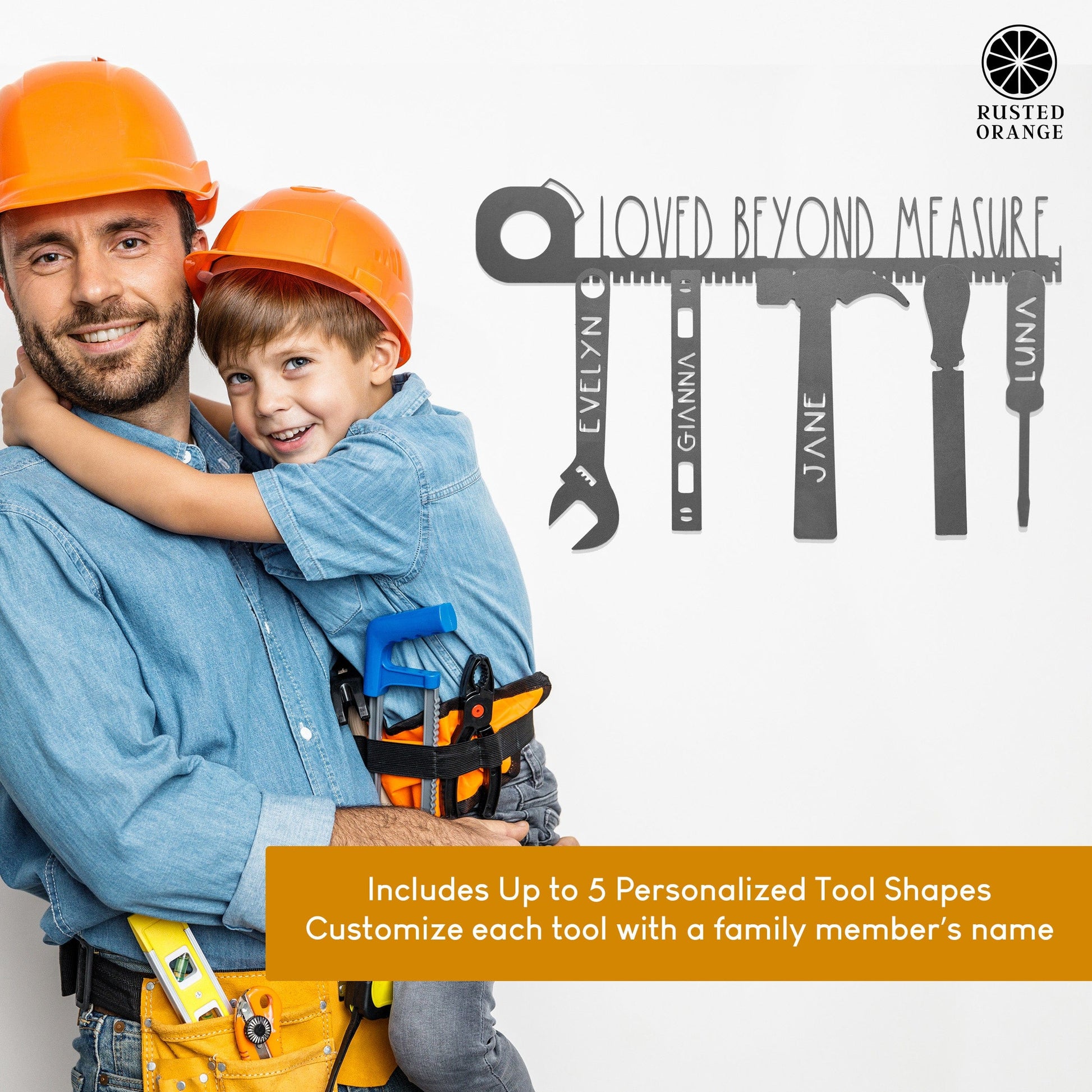 Gift the special dad in your life with this exceptional and customizable metal sign, the ultimate Father's Day present for any mechanic, handyperson, or DIY enthusiast. This personalized garage sign features intricately crafted metal-cut tool silhouettes that can be customized with the names of family members, making it a heartwarming, practical, and stylish addition to any dad's garage, workshop, or man cave. It's a unique way to celebrate the bond between a father and his children while providing a personalized touch to his personal space. Choose up to five tool-shaped silhouettes, each with customizable names of up to nine characters. If you prefer a blank tool, simply enter "blank." Should you need more tools to accommodate a larger family, visit the "Tools with Name - Individual" listing to order additional pieces. Each hanger can fit up to 7-8 tools on it, depending on the tools selected. The hanger for all the tools can also be customized with up to 21 characters, creating a truly personalized family name plaque for your dad or grandpa. This level of customization makes it a perfect choice for personalized fathers day gifts for grandpa or personalized fathers day gifts for papa. This unique dads garage sign is perfect for any dad who loves spending time in his garage, whether working on projects, fixing cars, or simply enjoying his personal sanctuary. The metal sign not only serves as a family hanging decor but also as a sentimental reminder of his loved ones. Watch his eyes light up when he sees this one-of-a-kind Father's Day gift that has been custom-made just for him. It's not just a simple fathers day decor, but also a statement of love, appreciation, and recognition of his hard work and dedication. Show your dad or grandpa how much you care with this custom name wall decoration that can be proudly displayed in their workspace, garage, or man cave. Your dad or grandpa will be reminded of the love and support of his family every time he looks at this beautiful, personalized piece of art.