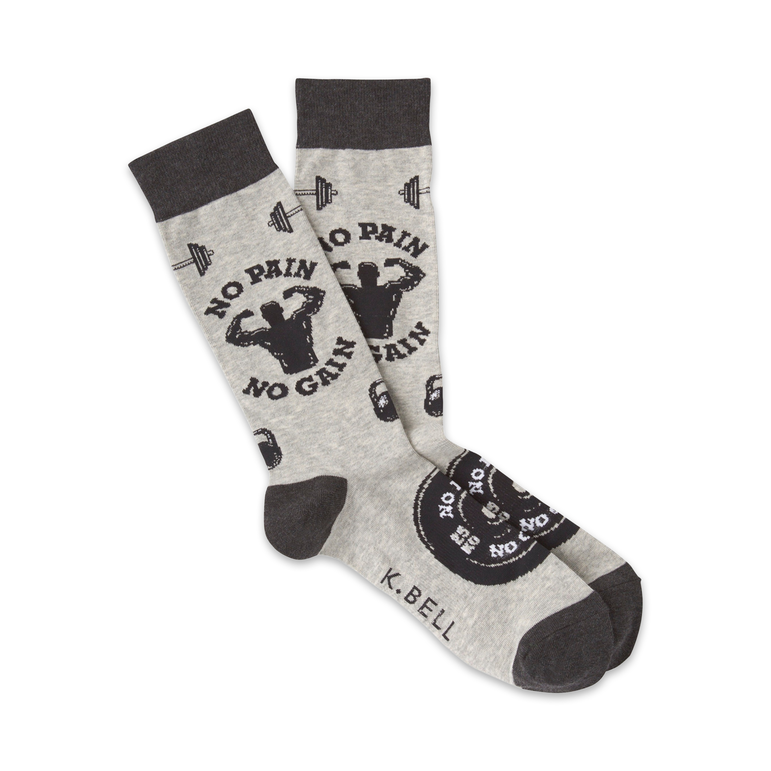 Go hard or go home! Hit the gym in style with a fresh pair of motivation. This cool pair of gray crew socks features a muscle man silhouette with the phrase "No pain No gain" around him. On the top of the foot is a black weight plate. With these socks you'll be making all kinds of gains!