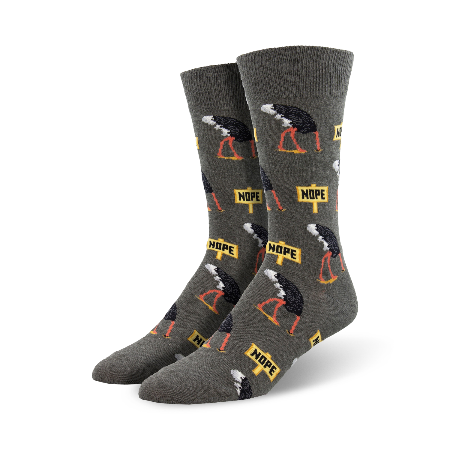 Who says ostriches hide their heads in the sand to avoid danger? These funny green socks declare the futility of hiding from the world with a big black and white ostrich and the word NOPE! ?¥. We don't know why ostriches stick their heads in the sand, but we do know these ostrich socks will bring a smile to everyone's face.