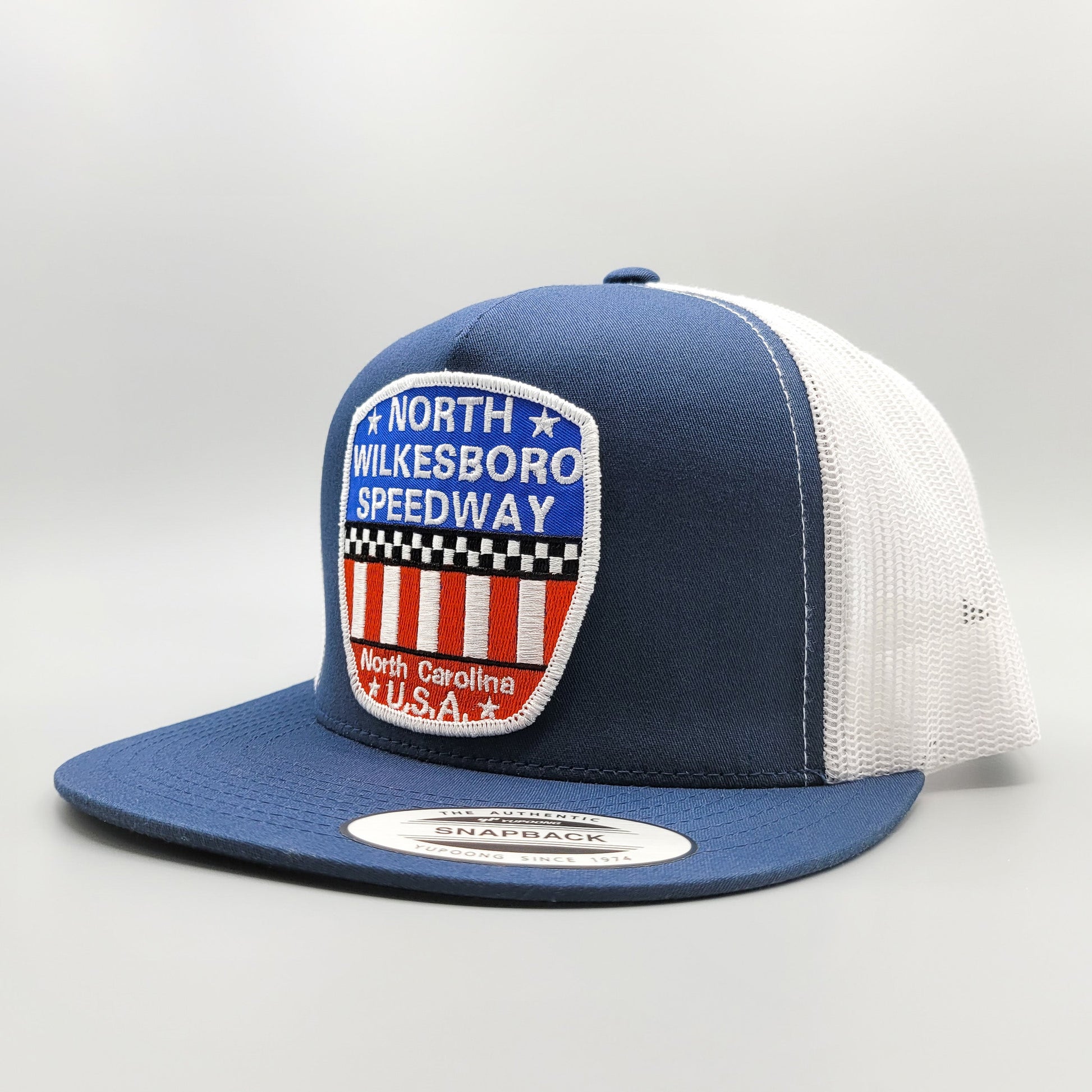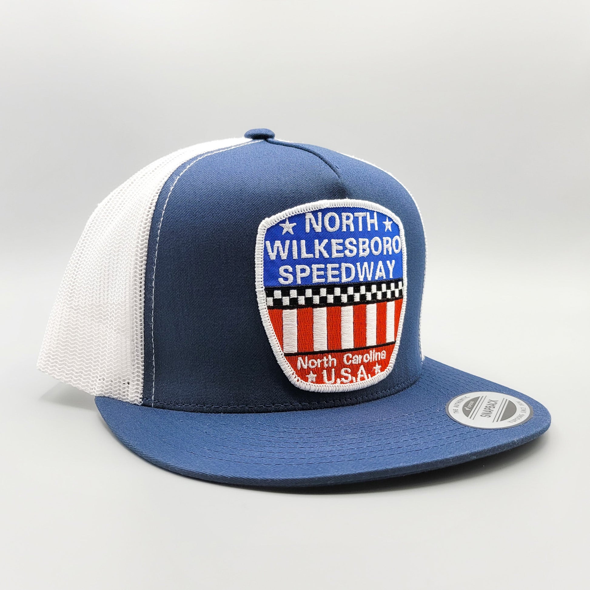 This is a beautiful, retro North Wilkesboro Speedway embroidered logo patch in red, white and blue applied to one of our best selling trucker hats -- a Yupoong 6006 Classic snapback trucker hat.
