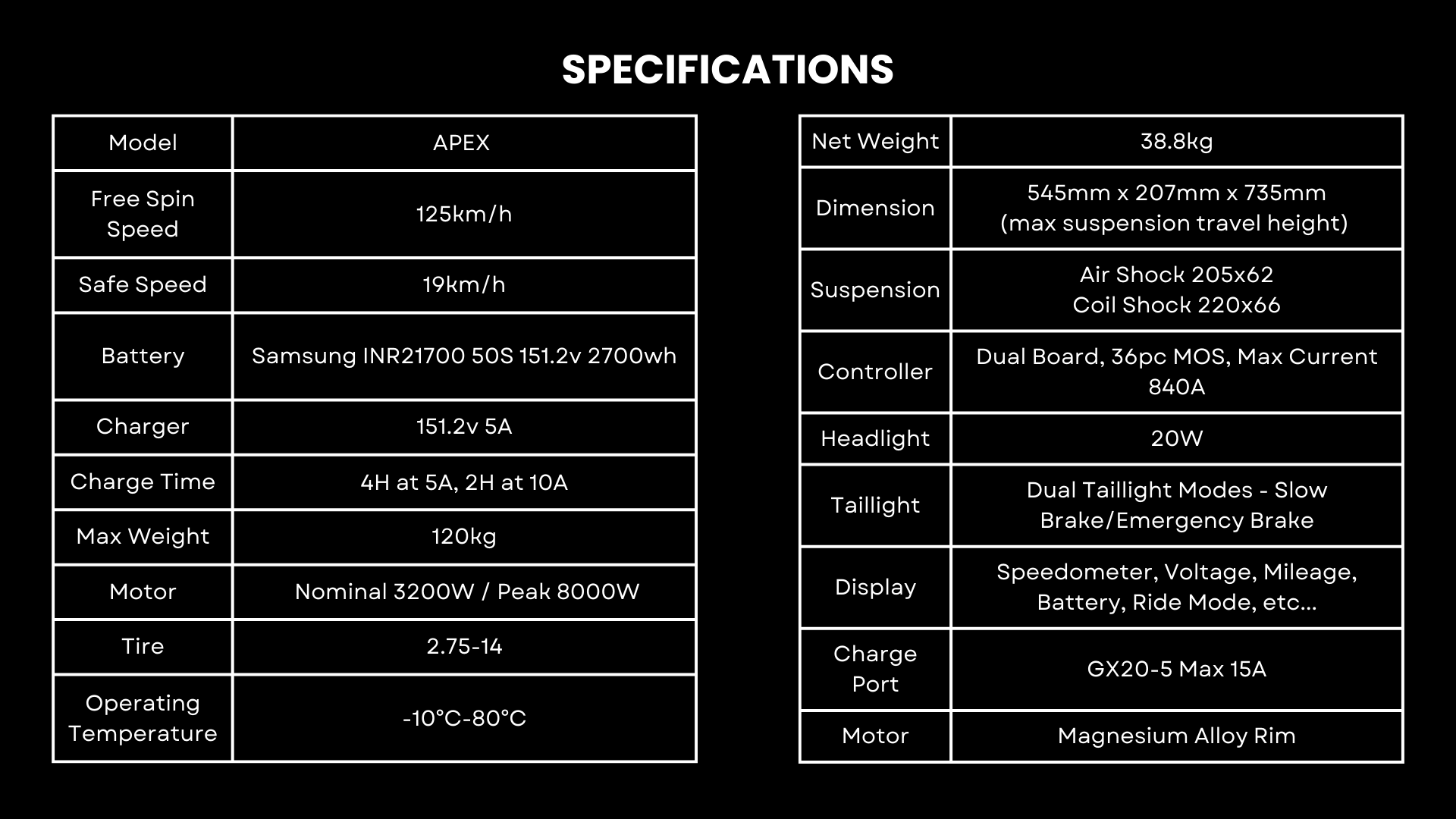 - Motor: 3,200W motor reaching speeds over 55 MPH