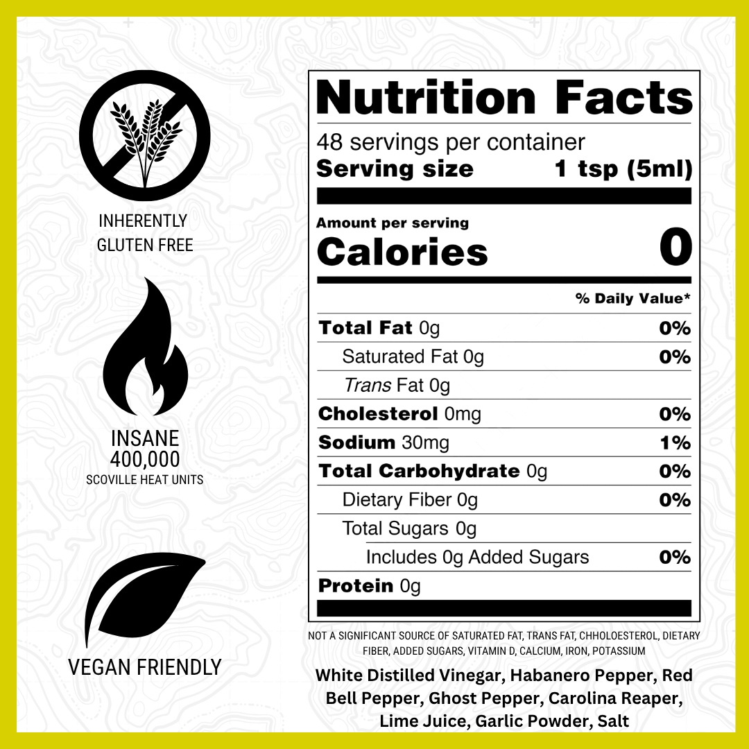 Not for the faint of heart. Diabolical in nature and crafted from some of the hottest peppers within the world. An intense ramping heat; stuffed full of Carolina Reapers, Ghost Peppers, and habaneros. The heat will be checking into your pain receptors and taking you for a wild ride.