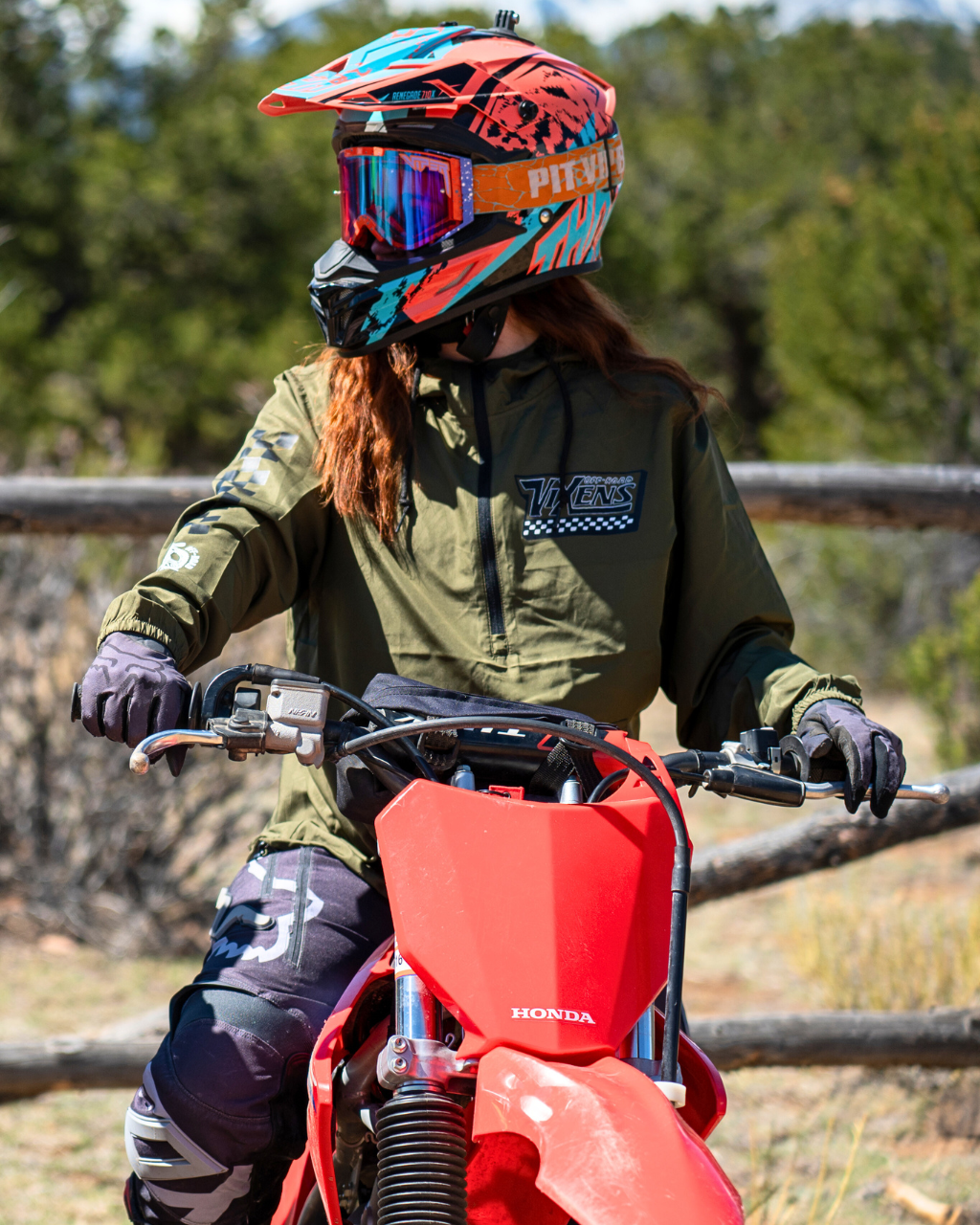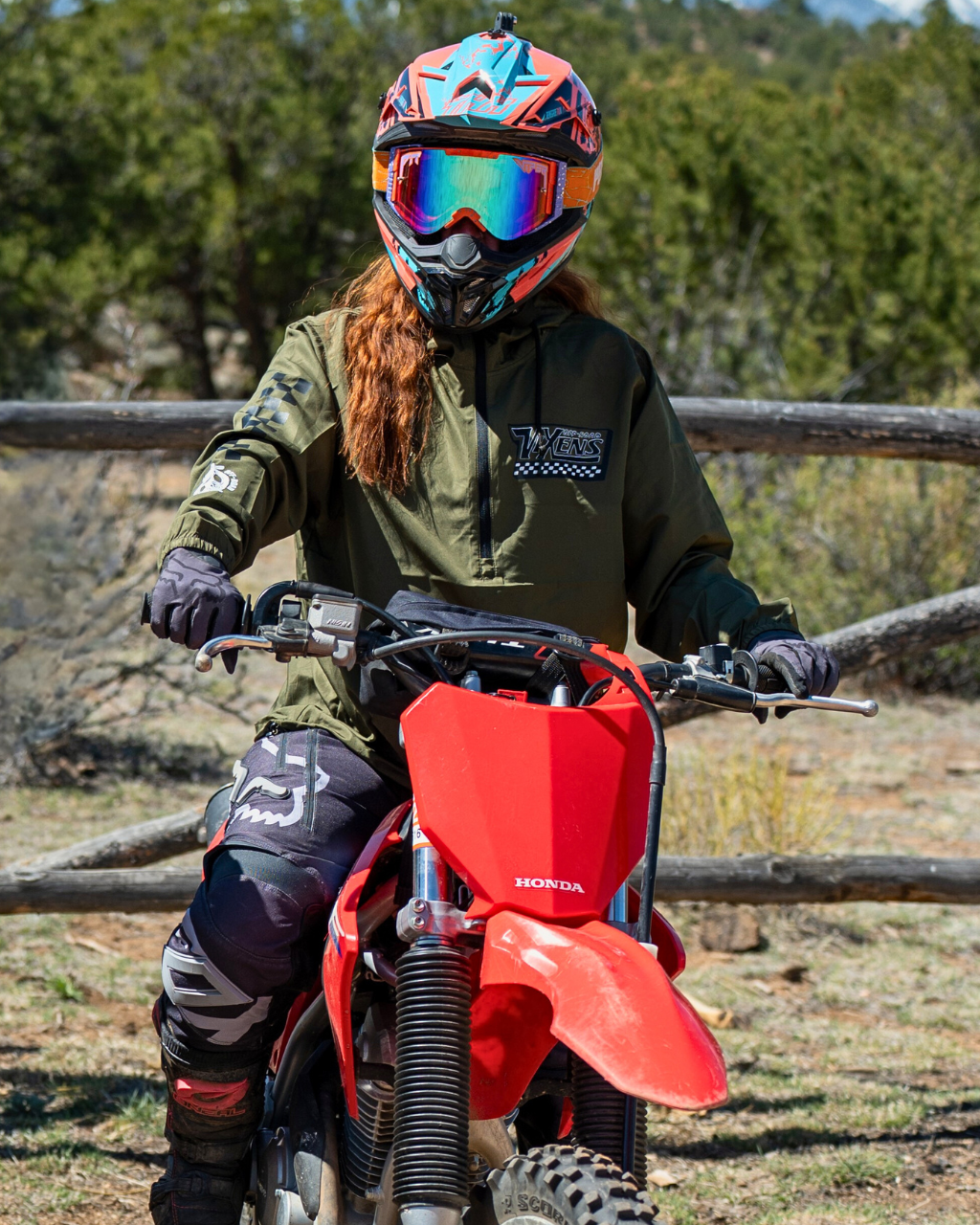 Experience the freedom of the open road with our Off the Wall Pullover Windbreaker! Designed for on and off-road adventures. This jacket features one of our most popular designs and as a bonus it is packable. Stay cool during summer rides and keep the wind at bay on cooler days. It's the perfect companion for any adventure seeker! You won't be able to resist this Military Green and Black color combo.