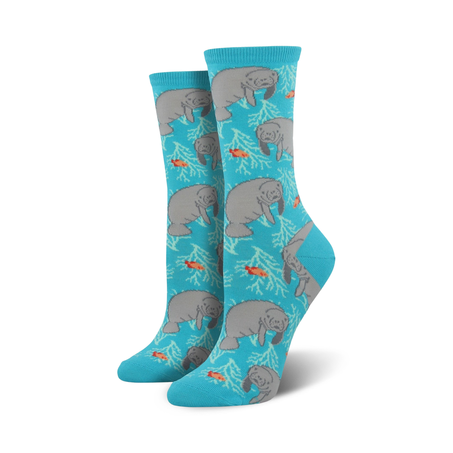 Let's face it, manatees are probably the cutest sea creature ever created by God. These adorable women's novelty crew socks have gray sea cows printed all over against a light blue background. For the love of hu-mantee, you need to get these cool socks now!