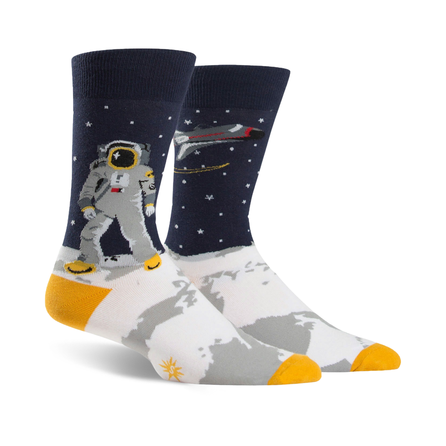 That's one small step for man, one giant leap for mankind! These cool socks are literally out of this world in a big way! Each fun pair of crew socks features a cosmic moon landing display fit for walks on the moon. Wear them when you plan your next trip to outer space!