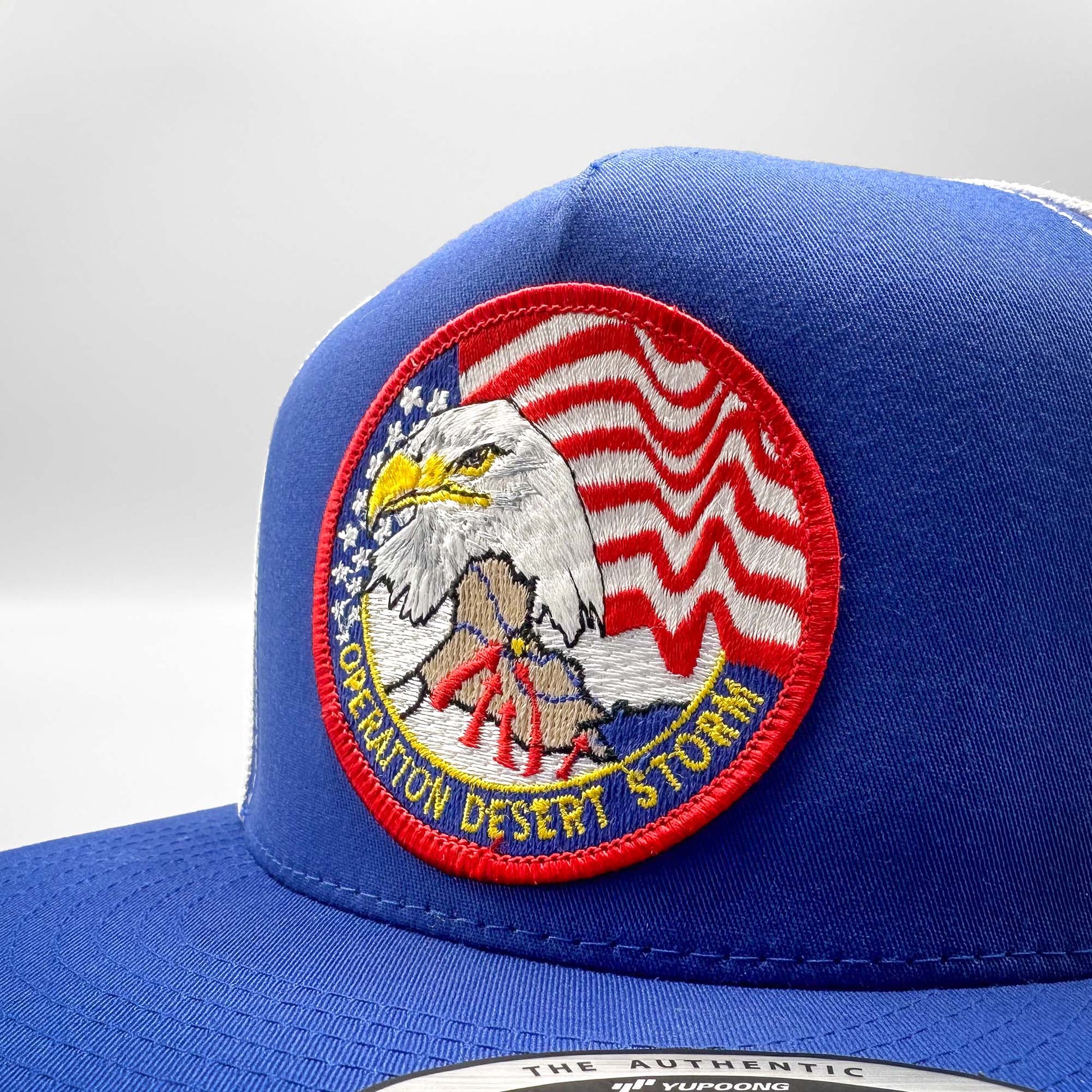 This trucker hat features a round Operation Desert Storm eagle embroidered patch on a premium royal blue and white mesh Yupoong 6006 Classic high-crown, mesh snapback baseball cap.