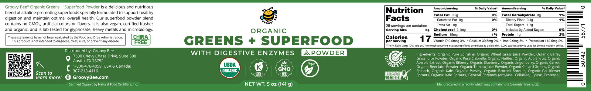 Our Groovy Bee® Organic Greens + Superfood Powder with Digestive Enzymes contains no GMOs, processing aids, excipients, carriers, artificial colors or flavors and is certified Kosher and organic. It is also plant-based, non-China and extensively lab tested for glyphosate, heavy metals and microbiology.