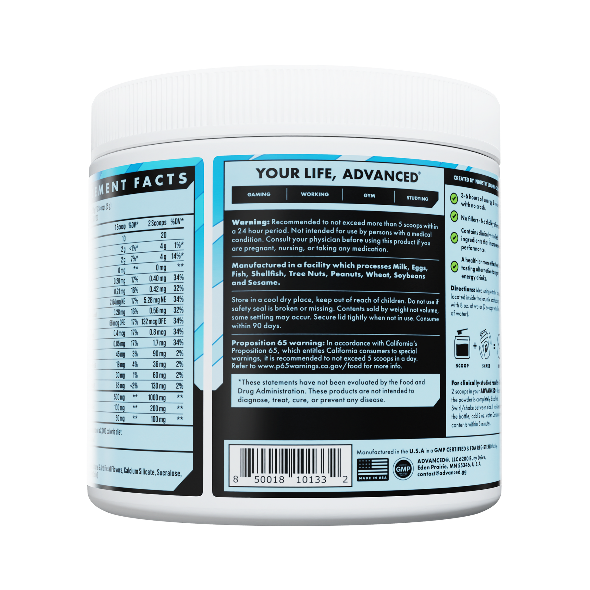 Looking for an energy supplement to help you dominate your gaming sessions, power through the workday, or crush it at the gym? Then ADVANCED ENERGY is what you’re looking for.