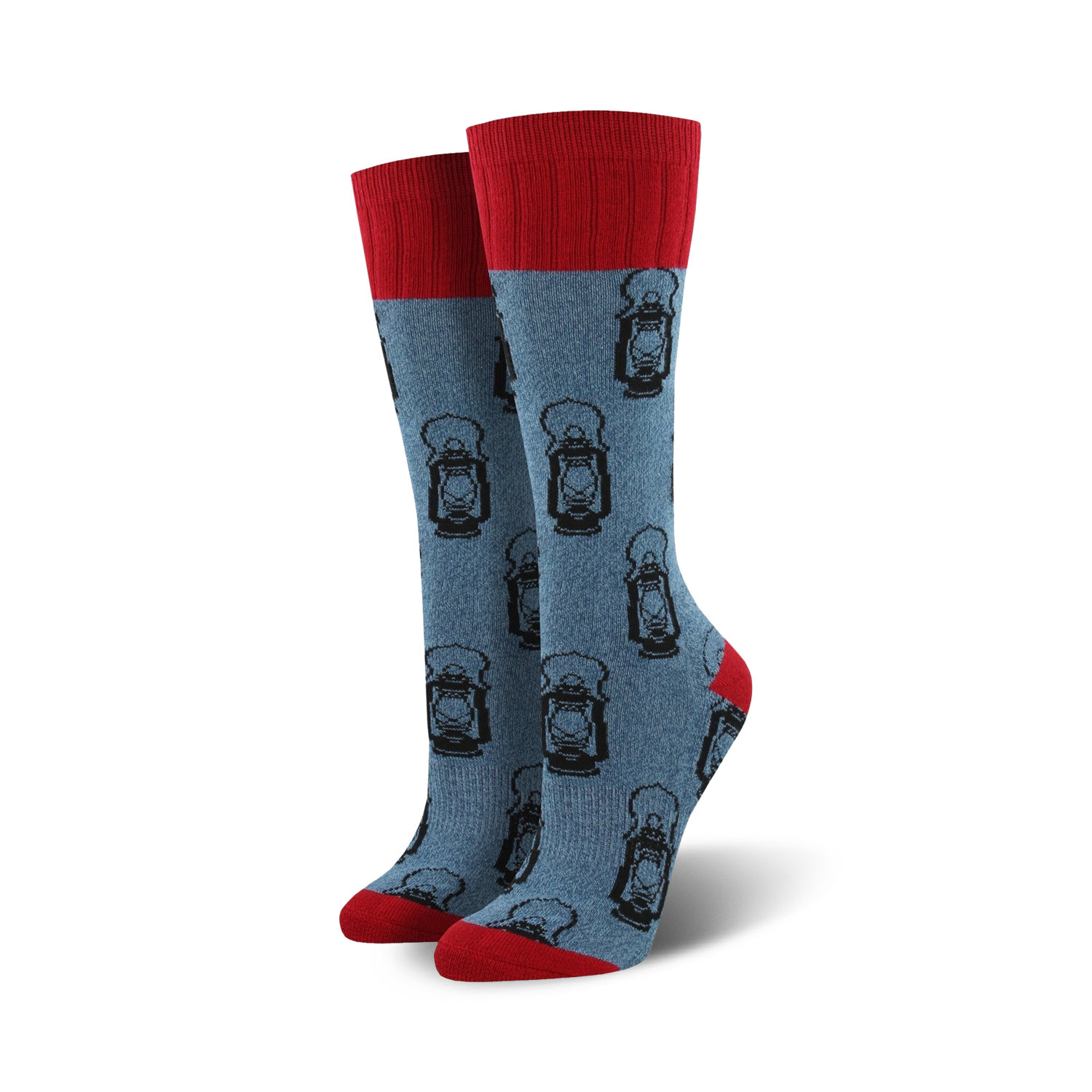 The Outlands Lantern socks are perfect for the woman who loves adventure and the great outdoors. You'll hike with a spring in your step (or run) when you see these socks smiling back at you from inside your boots - they're bold, blue with a red cuff and a sprightly pattern of black lanterns. They'll bring a spark of joy to any outdoor excursion, whether you're hiking, camping, or just taking a stroll through the park. Ready to step into wonderland?