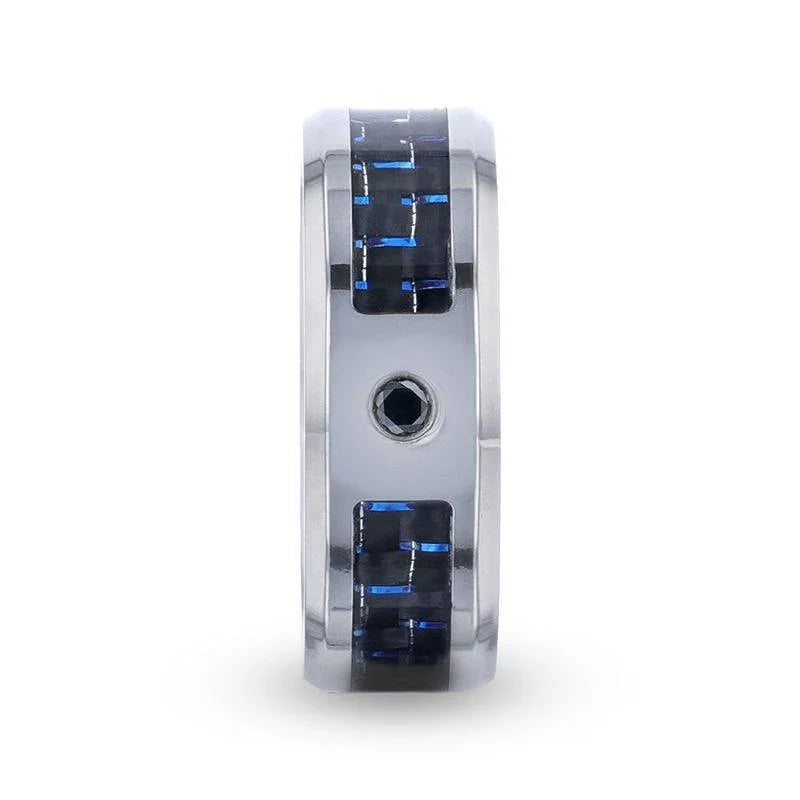 - Titanium band with a black and blue carbon fiber inlay, black sapphire center stone, and polished, beveled edges.