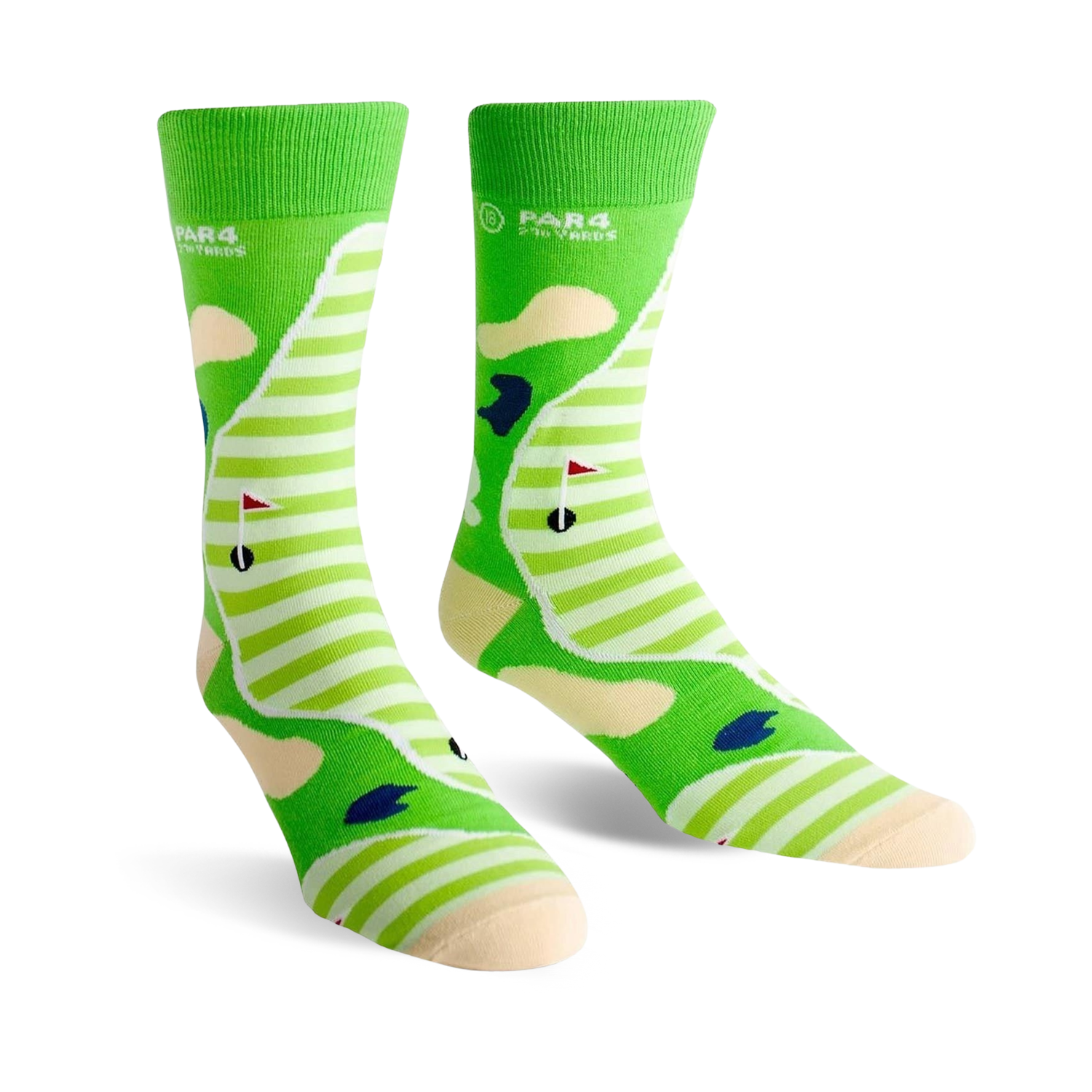 Fore! Sink your toes into the Par 4 novelty crew socks for men, with their refreshing green and white stripes and a colorful golf course pattern on each sock. From the fairway and tee to the green and flag, you'll feel like you've hit the green in style. On your next par or even a triple bogey, these socks will have you putting around in comfort while looking like a golf pro.