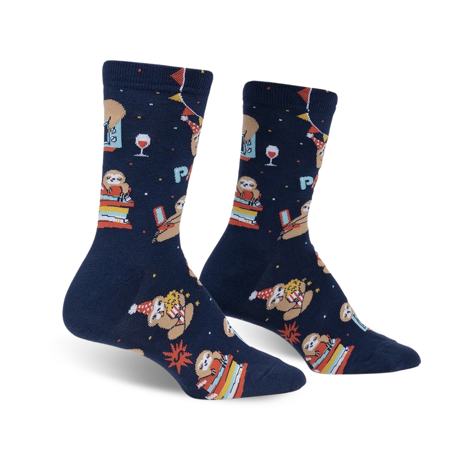 Party Hardly! These dark blue crew socks are covered in an entire posse of sloths wearing colorful party hats and celebrating with noisemakers, champagne glasses, books, and popcorn. Sloths are famous for their slow and easy lifestyle, but these sloths are ready to party! You'll also be ready to party once you slip these on your feet. They are so comfortable that you might even find yourself dancing. Yes, dancing!