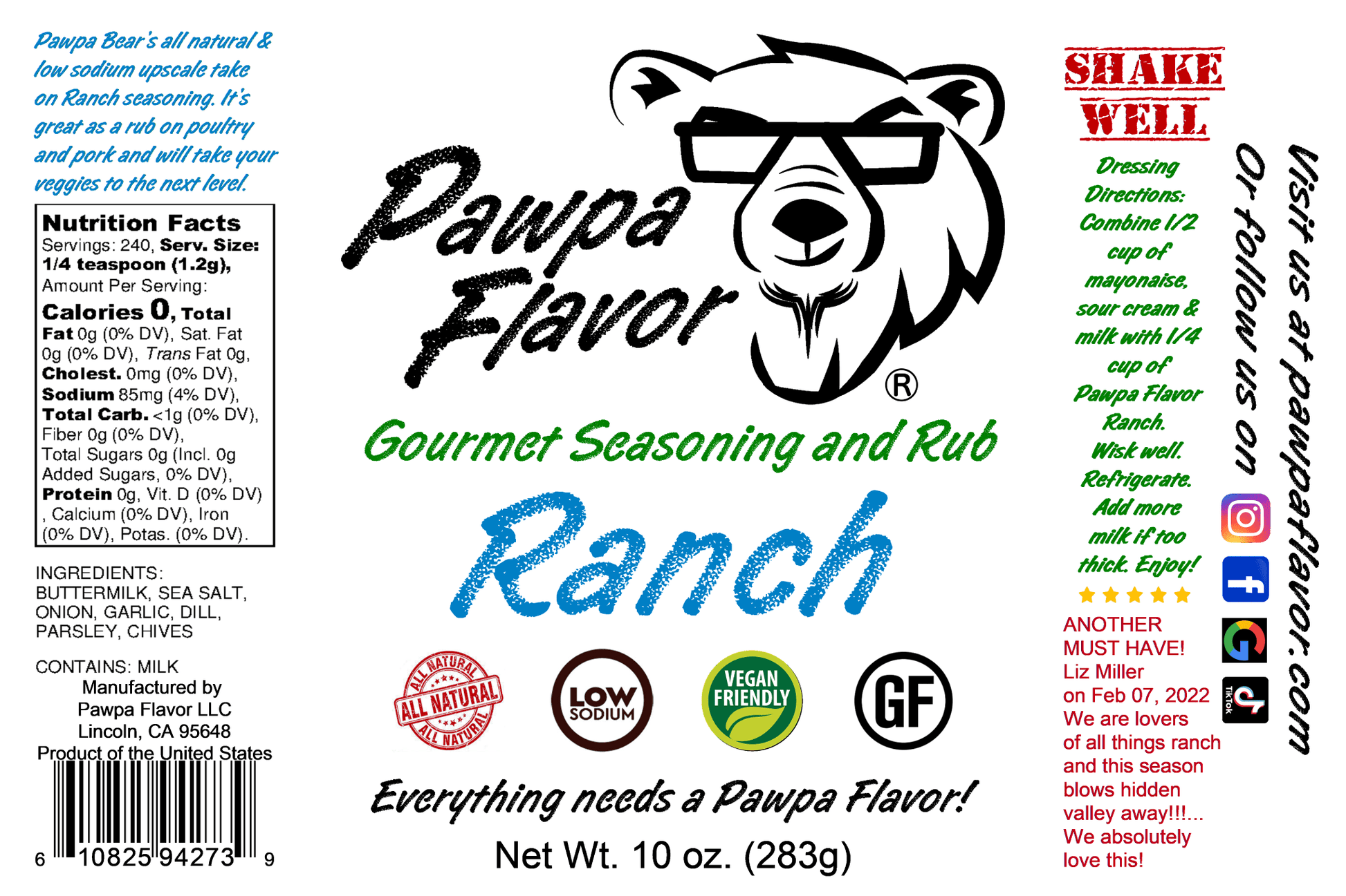 Ideal for seasoning everything from proteins and vegetables to salads, dressings and dips, Ranch Seasoning & Rub brings a taste of homemade ranch to your kitchen with ease. With no artificial additives or preservatives, it’s the pure, natural choice for enhancing your favorite dishes with the timeless, comforting flavors of ranch.