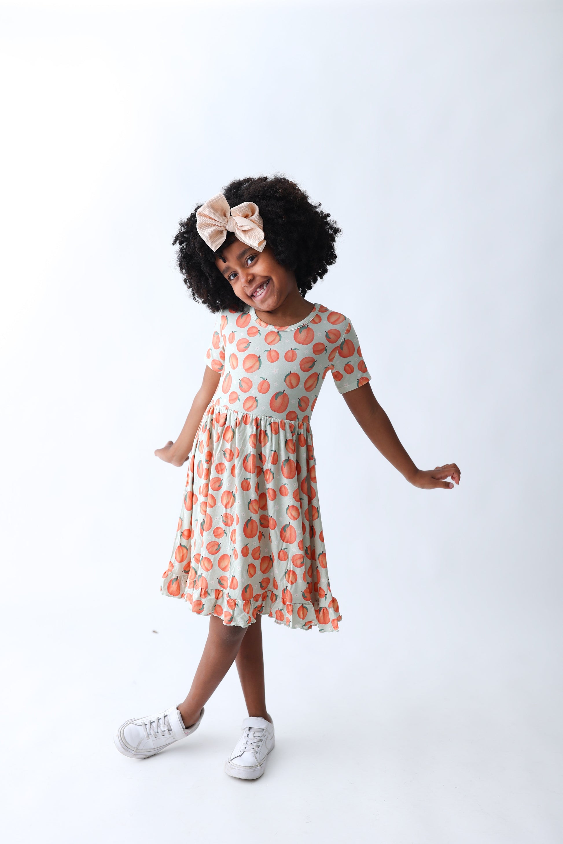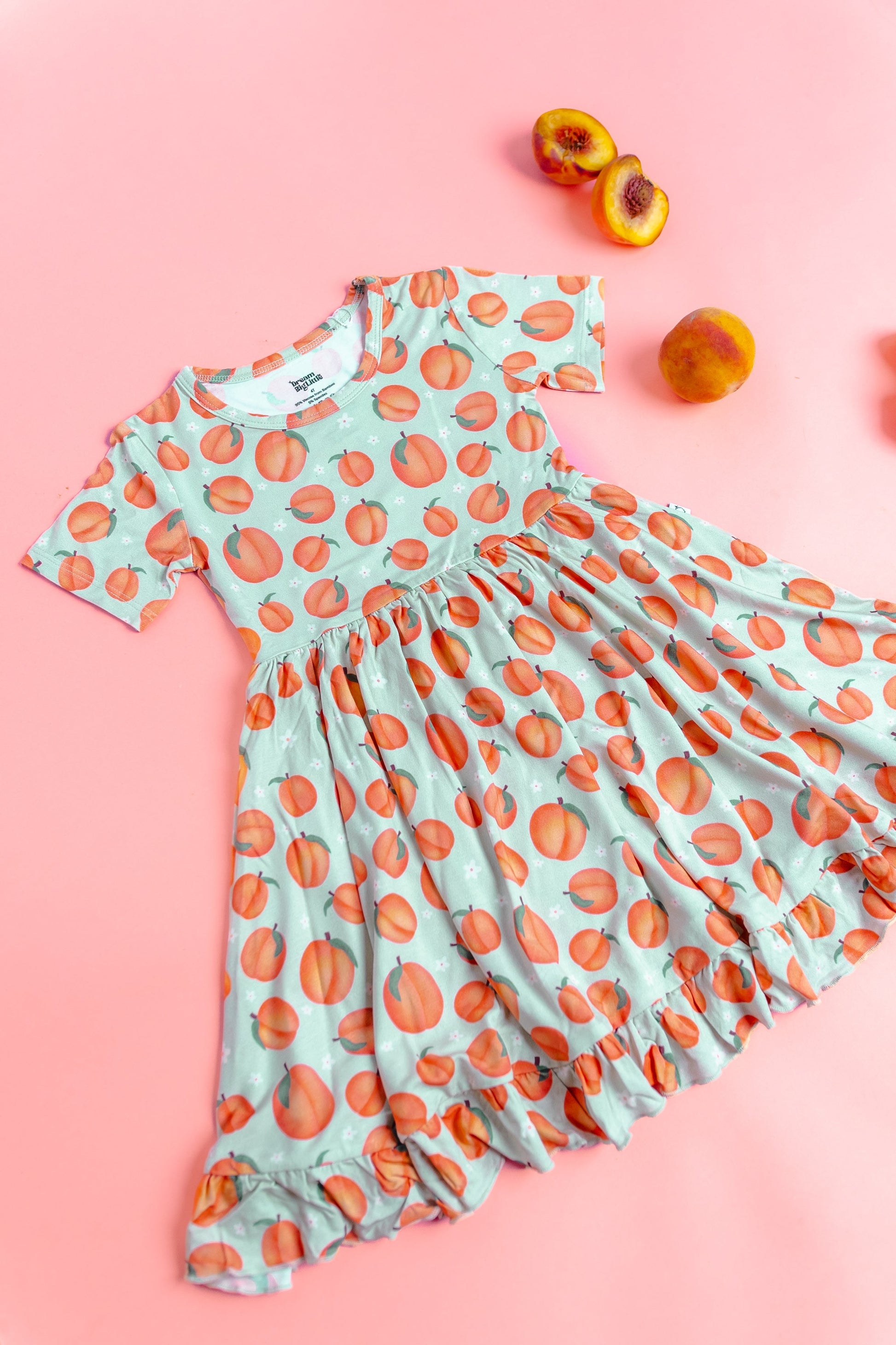 Get ready to feel like a peachy-keen dream in this playful ruffle dress! Featuring a fun peach print and short sleeves, this dress is perfect for spring and summer. Don't miss out on adding this quirky and stylish piece to your wardrobe!