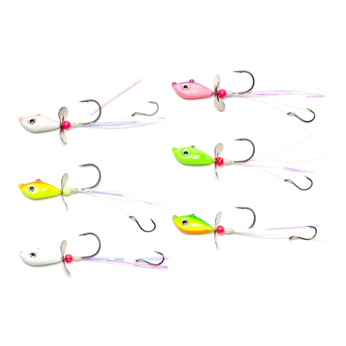 A shad style head with two-line tie points for vertical and horizontal presentations, this unique Addicted Fishing jig features a propeller spinner on the shank that provides built-in action, flash and a bubble trail in the water. A setback stinger hook is part of the integrated package – perfect for tipping with a nightcrawler or soft plastic. Jig head molded onto at 32746NP-BN. The 92553NP-BN stinger hook is setback by 1.5"