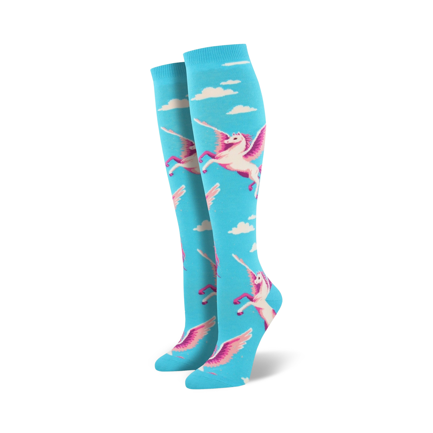 Do you believe you can fly? Do you believe you can touch the sky? Well, with these cool socks you may just achieve the impossible! Each awesome pair of women's novelty crew socks feature the famous winged horse, Pegasus, printed all over against a sky blue background. Every great dream begins with great socks! Get a pair now.