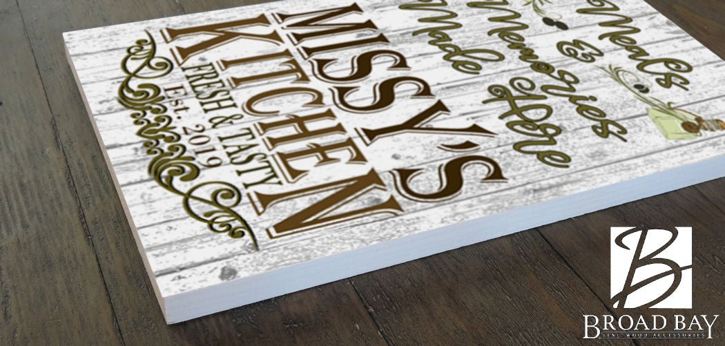 These personalized kitchen name signs are perfect, custom kitchen gift ideas for a woman or man, any cook or chef! The unique rustic style kitchen designs are personalized with a cook's name and/or an established date and printed on solid wood. Carefully crafted from solid wood, these unique, personalized kitchen name hanging wood signs will be cherished for years to come and proudly displayed in any kitchen. The personalized, farmhouse-style kitchen designs are carefully applied to the wood with our VibrantPrint process: a unique method developed by Broad Bay. No matter the style, these kitchen name signs are an ideal and top gift idea! Well Sized - 16.5in x 11in!