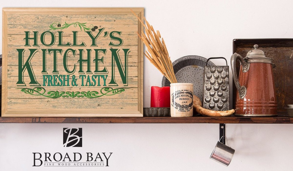 This Broad Bay personalized kitchen sign is the perfect unique personalized gift idea for her or him. The vintage kitchen design is personalized and printed on solid wood. Carefully crafted in the United States from solid maple wood this unique custom-made rustic kitchen name hanging wood sign will be cherished for years to come and proudly displayed in any kitchen decor. The personalized artwork is carefully applied to the solid maple wood in a unique process developed by Broad Bay to allow the beauty of the wood to show through the customized kitchen name design. Personalized with the kitchen chefs name, this vintage look kitchen gift is the perfect personalized gift for Christmas or any occasion!
