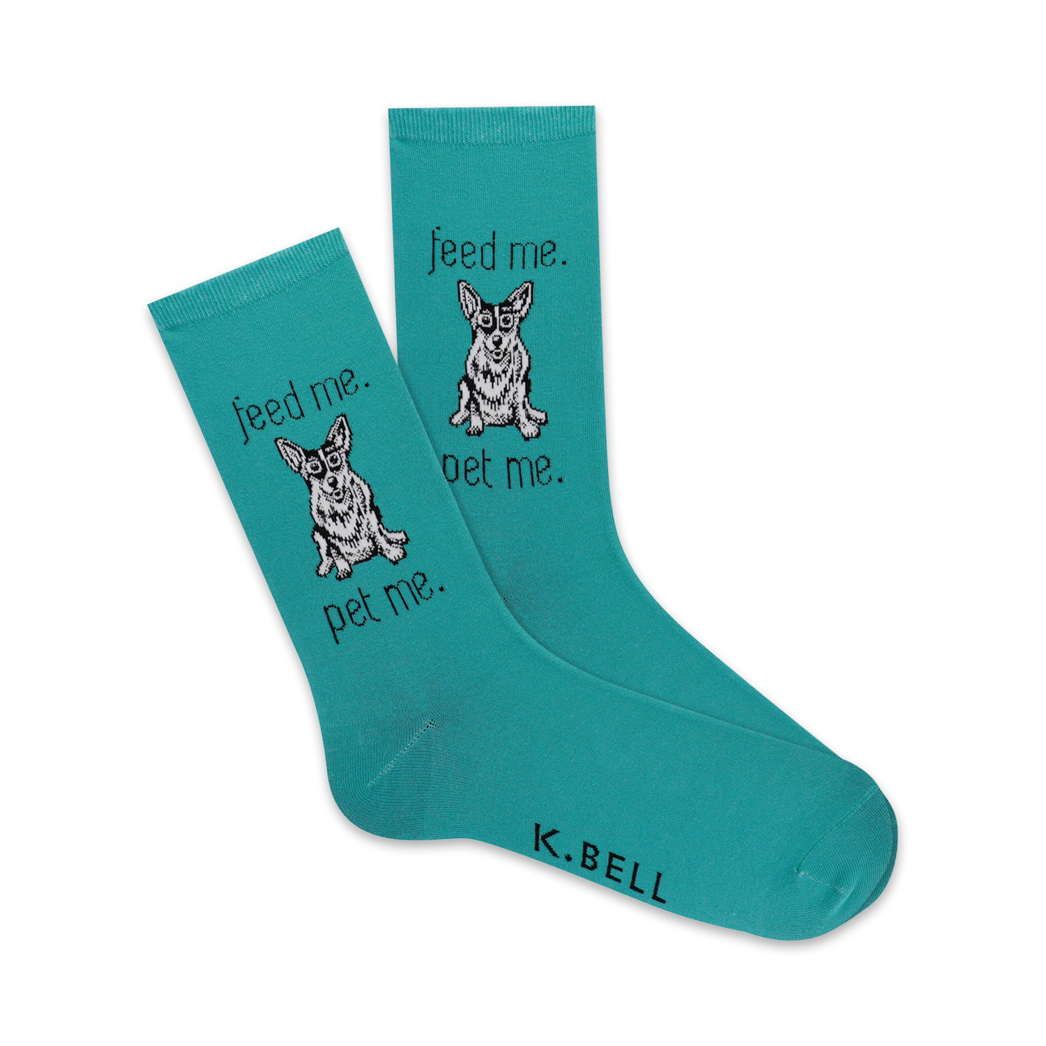 Show your inner dog lover with these turquoise crew socks showcasing a black and white doggo wearing glasses. With words like "feed me" and "pet me" displayed boldly, these socks will make a dog lover smile. Paw-some socks for paw-some people.