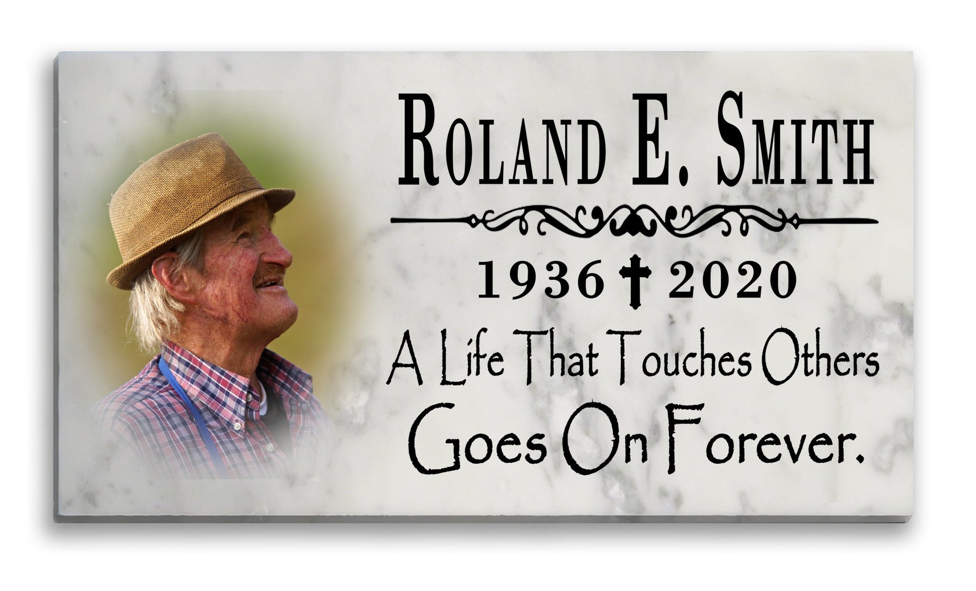 Celebrate a life well lived with this personalized marble memorial plaque, printed with your loved one’s name, dates, photo, and the phrase: “A Life That Touches Others Goes On Forever.” This timeless remembrance stone is made for indoor or outdoor display and offers a beautiful way to preserve their memory.
