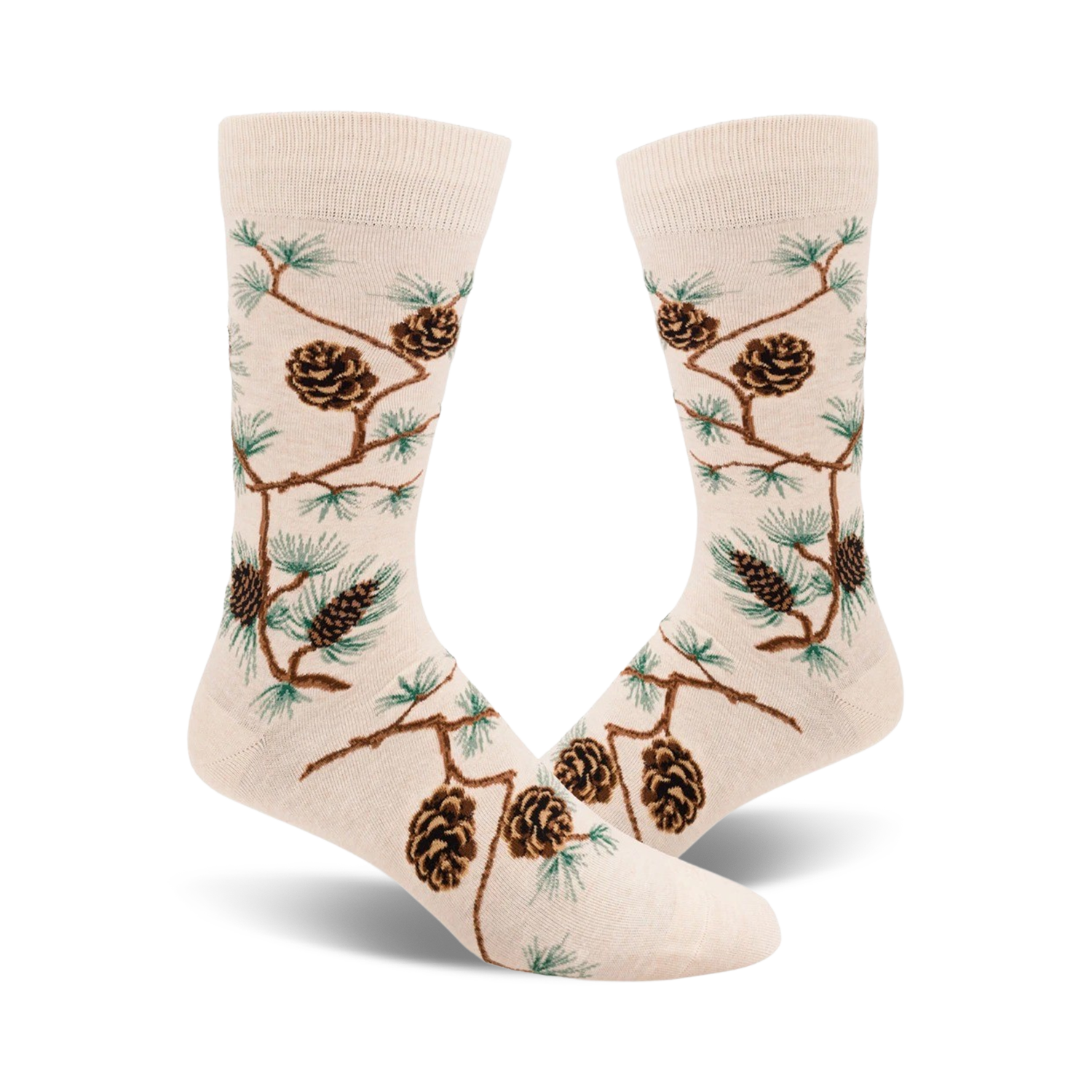 You'd Be Pining for These! - Sure, they're just socks, but with these Pinecone Crew Socks, you get more than just foot coverings, you get a whole winter wonderland right on your feet. Imagine the piney scent of a fresh forest, the crisp crunch of snow underfoot, the cozy warmth of a crackling fireside and all the joys of the season bundled into one comfy, breathable pair of socks. These fun crew socks feature an allover pattern of brown pine cones and green pine needles on a crisp white background that will make you want to snuggle up by the fire with a mug of hot cocoa or grab a pair of skis and hit the slopes, no matter the weather outside.