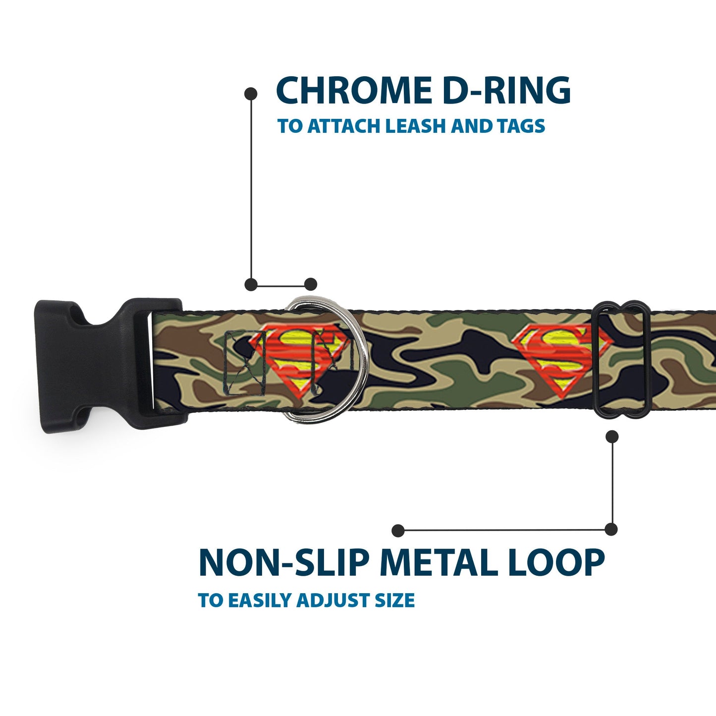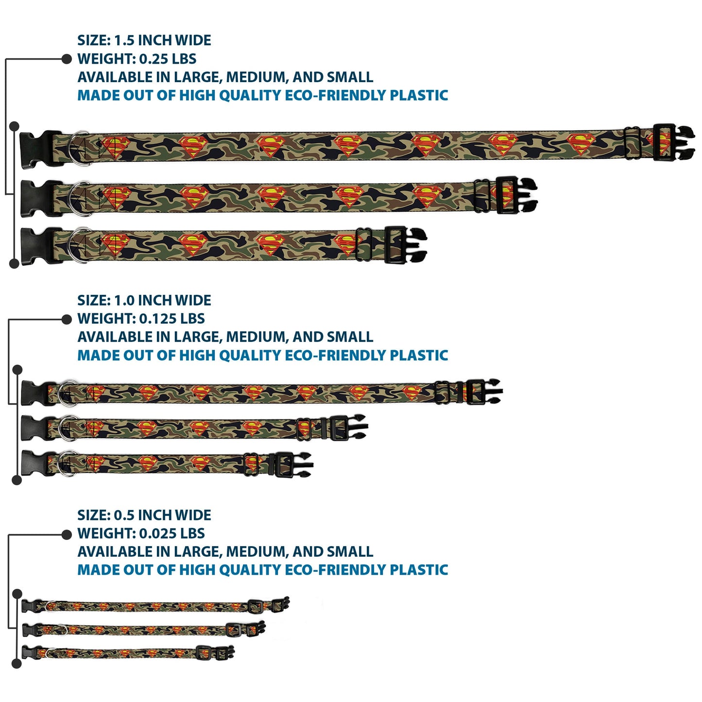 Vibrant and bold, this beautiful, polyester dog collar is made to show off your dog's unique style through all the seasons. With an overengineered plastic buckle and strong D-ring, this durable collar can hold up to whatever your dog can dish out. This product is officially licensed by DC Comics.