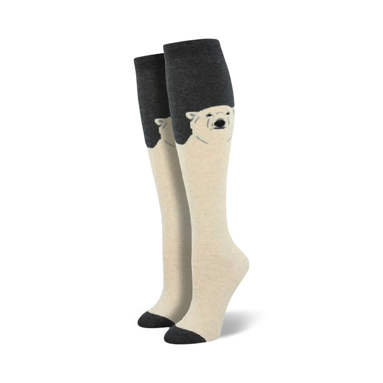 Brace yourself for those cold nights with a cute companion wrapped around your toes! These cute socks are un-bear-ably adorable. We know bear puns can be a bit polar-rizing. Each fun, gray and off-white knee high sock features a solid color blending into a polar bear up the calf.