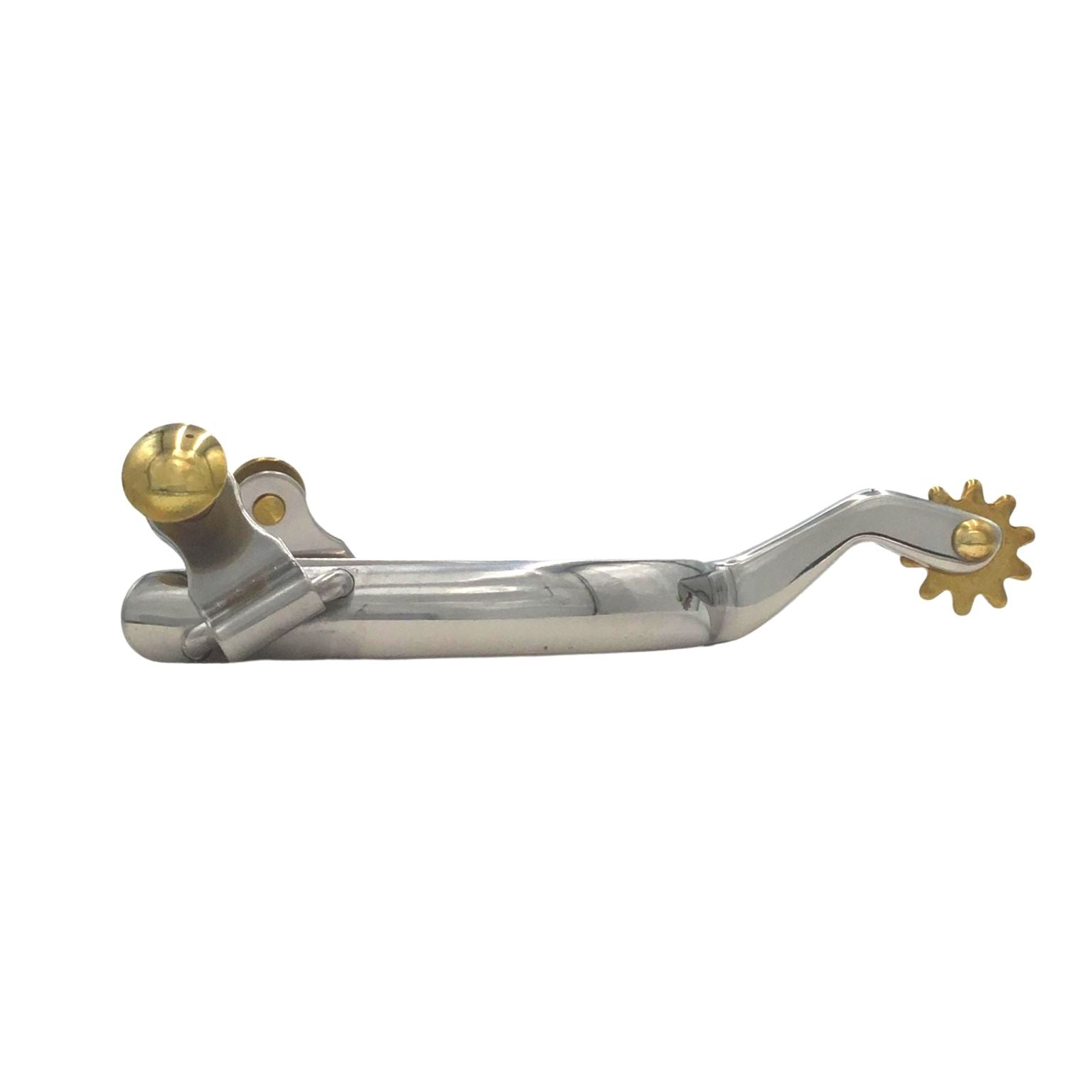 This is a great all around using spur that rides well on the boot and communicates effectively with a horse. A stainless steel spur with 9/16" band. 5/8" brass rowels and brass buttons.