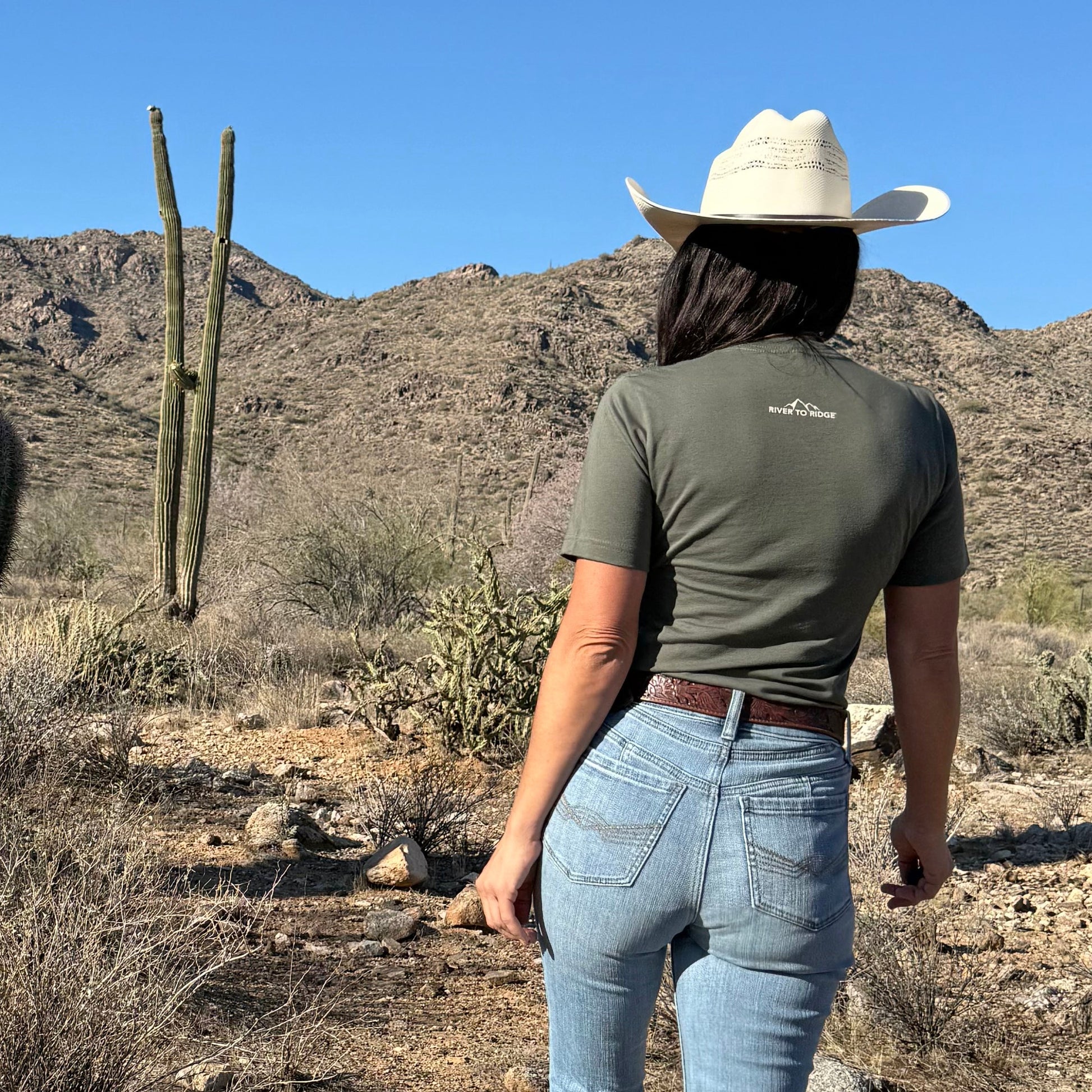 Praise His Name, from the River to the Ridge! There is such an incredible connection with God in the great outdoors! Our new Women's T's are ultra soft, and relaxed fit in 100% combed pre-shrunk cotton. Color: Army
