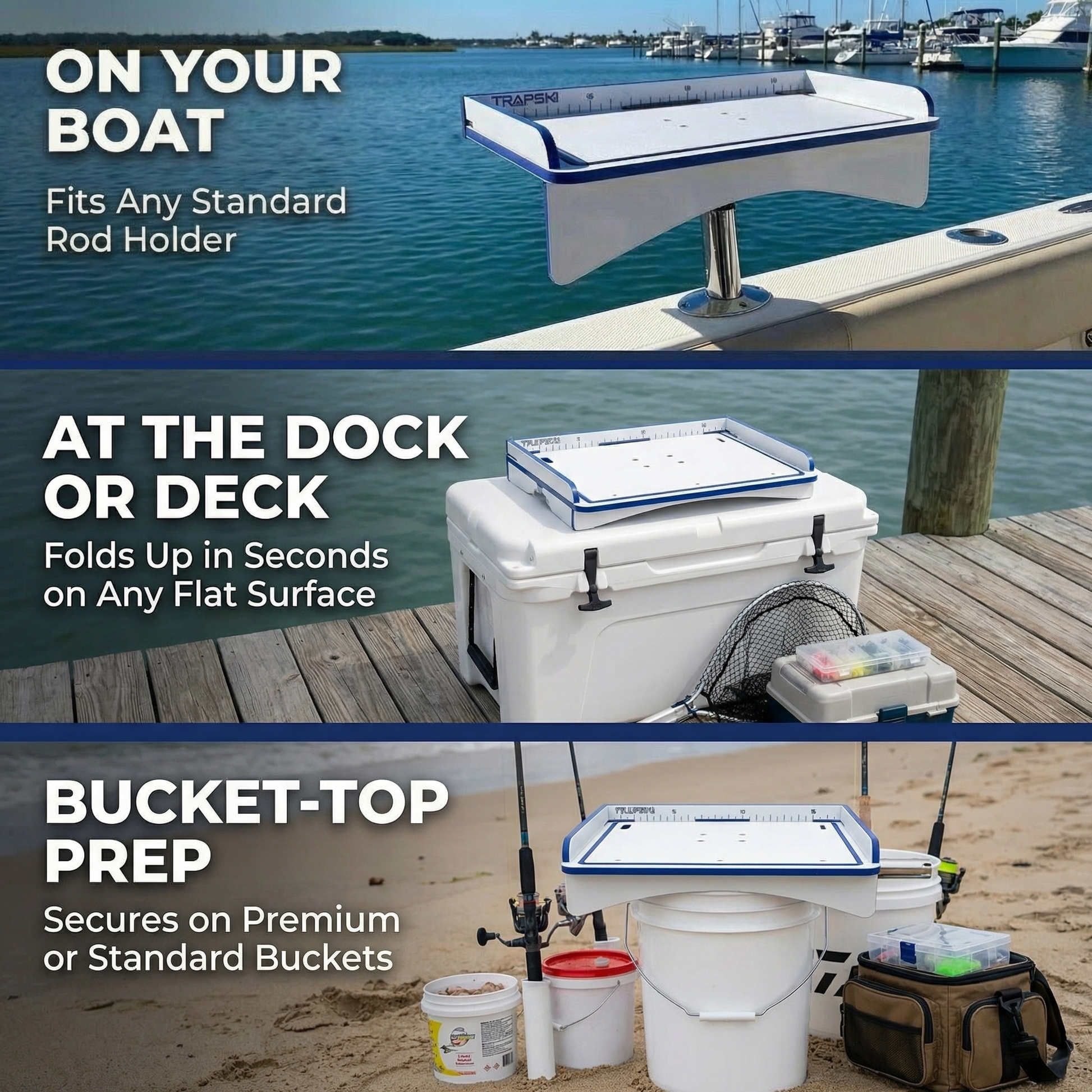 ✅ 3-in-1 Compatibility – Use it in a rod holder, across 2 buckets, or on flat surfaces like coolers, tables, or gunnels