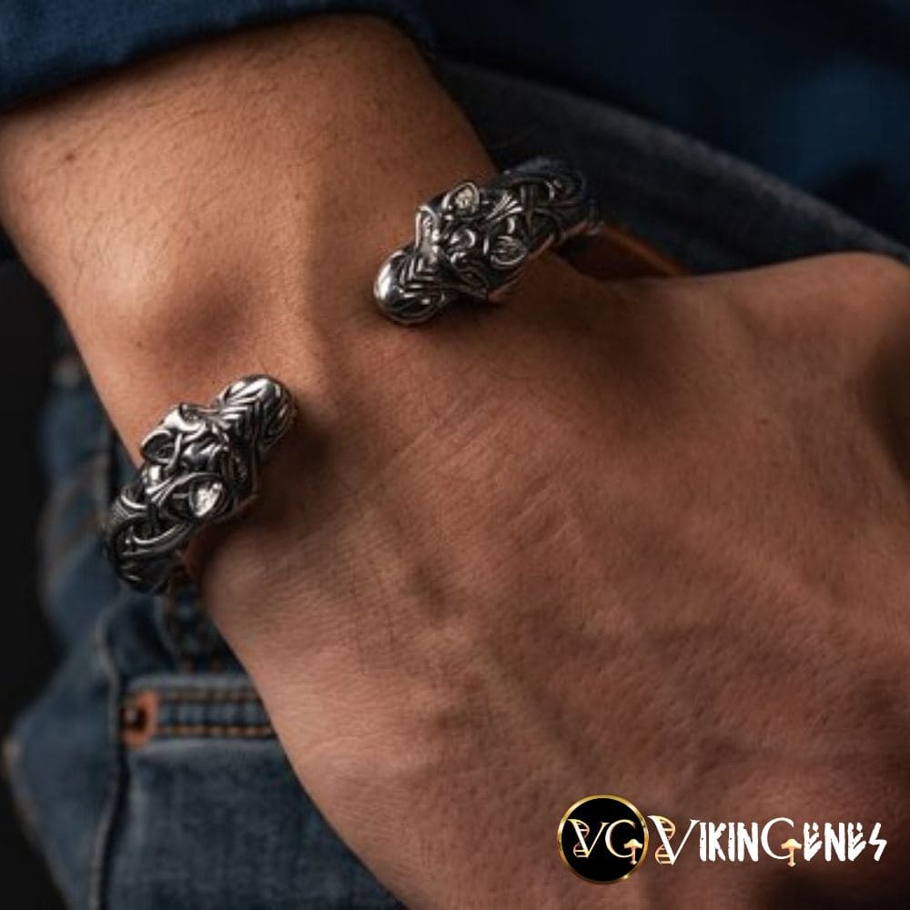 This beautiful hand-crafted Viking bracelet depicts the head of a wolf on each end. Wolves had great importance to Viking / Norse mythology, and this bracelet is representative of the monstrous wolf Fenrir who battles and slays Odin during Ragnarok (the end of the world). This style bracelet was actually worn by Viking people many centuries ago and is inspired by artifacts found on the Isle of Gotland (Sweden) and from dig sites in Iceland.
