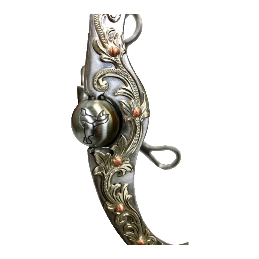 The Pro Series 7" Stainless steel satin finish cheek has stainless steel shanks placed at an angle for precise control. It has striking stainless steel & copper Flower accents and a 5” Medium Port Mouth