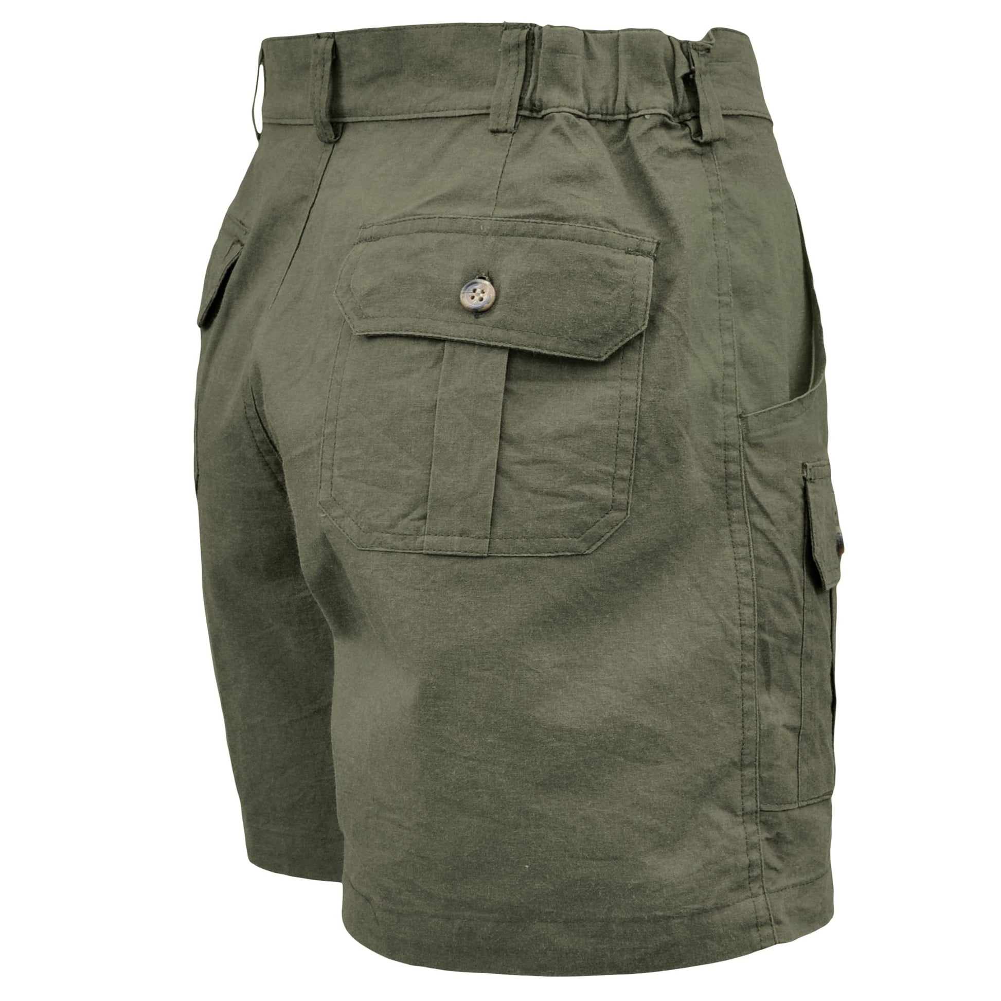 Hunting Shorts for women, with multiple pockets and a short 5½" inseam, have been the choice of professional hunters and safari trackers on the African continent for years. Two button flap cargo pockets in front, two more in back, and two side pockets at the hip, offer generous storage for essential outdoor gear. The bellows design in front allows freedom of movement without restriction. The 100% pre-washed cotton is durably lightweight, easy to care for, and doesn't snag when tracking game through the underbrush.