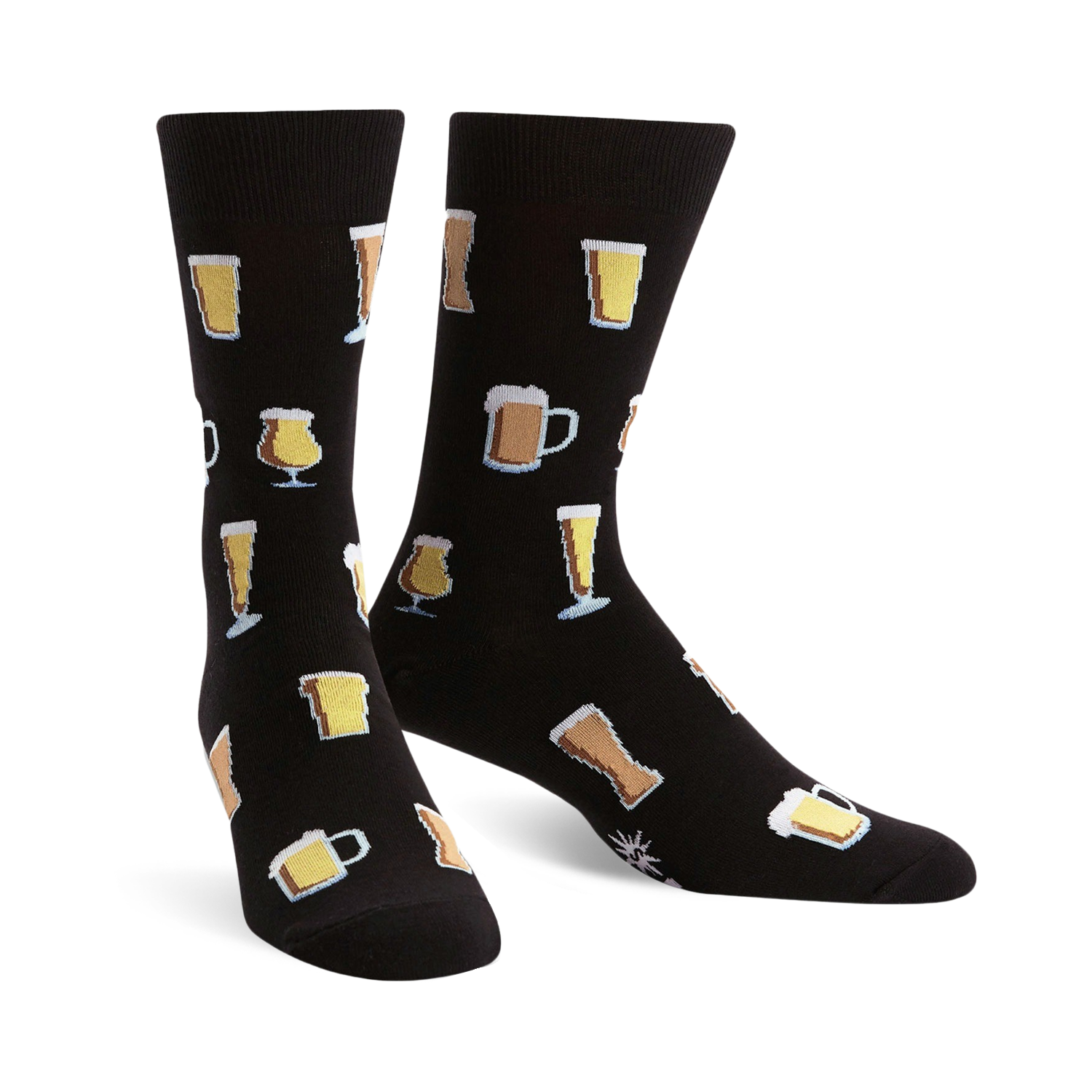 Feeling thirsty? Instead of heading to the fridge, slip on these Prost! beer socks and the party can start right on your feet! These black socks feature an allover pattern of frothy beer glasses and steins in brown, yellow, and white that will quench your thirst for style and make a statement in any situation. These fun and festive beer-themed socks are perfect for any beer lover and will be sure to get a reaction from anyone who sees them. Even if your friends don't want a beer, they will still think these socks deserve a round of applause. Wear them to a kegger, a brewery tour, the beach, or even to your next meeting (if you're feeling bold) and be sure to raise a glass to your amazing sense of style.