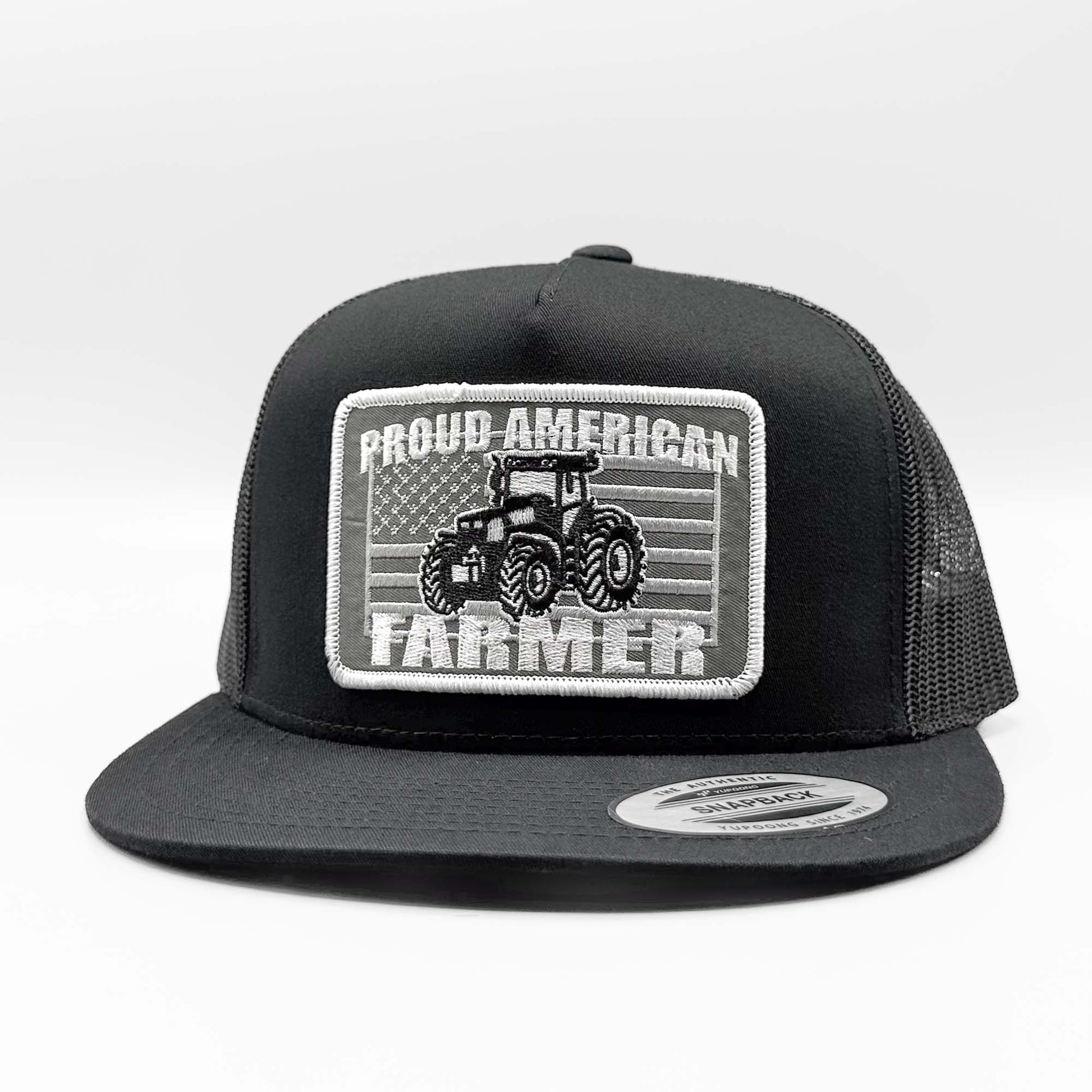 This is a Proud American Farmer embroidered tractor patch on one of our best selling trucker hats -- a Yupoong 6006 Snapback Classic Trucker Hat. Get that classic trucker hat look in a high-crown cap with a cool patriotic flat bill mesh baseball cap.