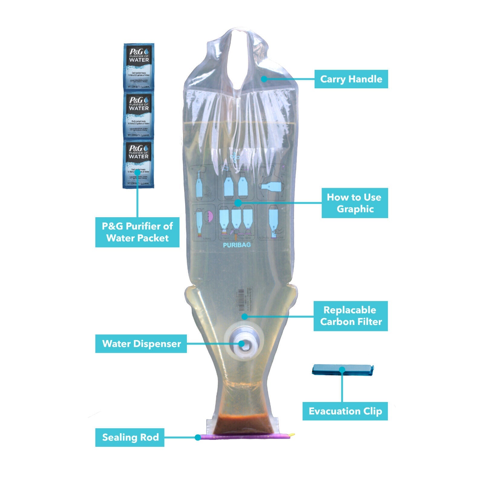 The P&G Purifier of Water Purification is an all-in-one solution designed to provide clean and safe drinking water for families and communities affected by disasters. The kit includes the Puribag, 12 P&G packets, a draining clip, and a sealing rod. The solution has a multi-treatment system which includes the P&G purifier and charcoal filter, making it highly effective. Here are four informative descriptions of the P&G Purifier for Water Purification: