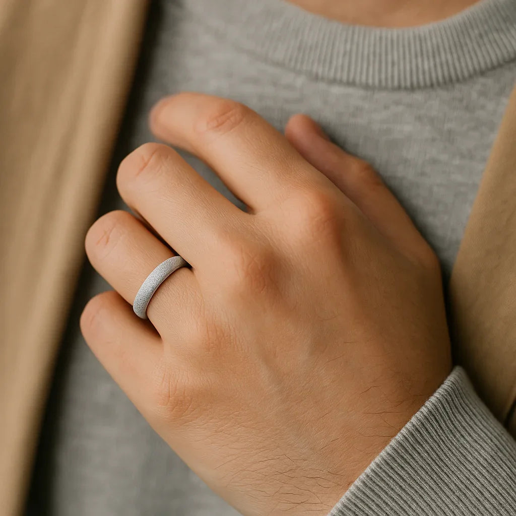 This unique Tungsten Carbide ring by Thorsten features a sandblasted finish giving the ring a sparkling look as though its surface was embedded with tiny, shimmering crystals.