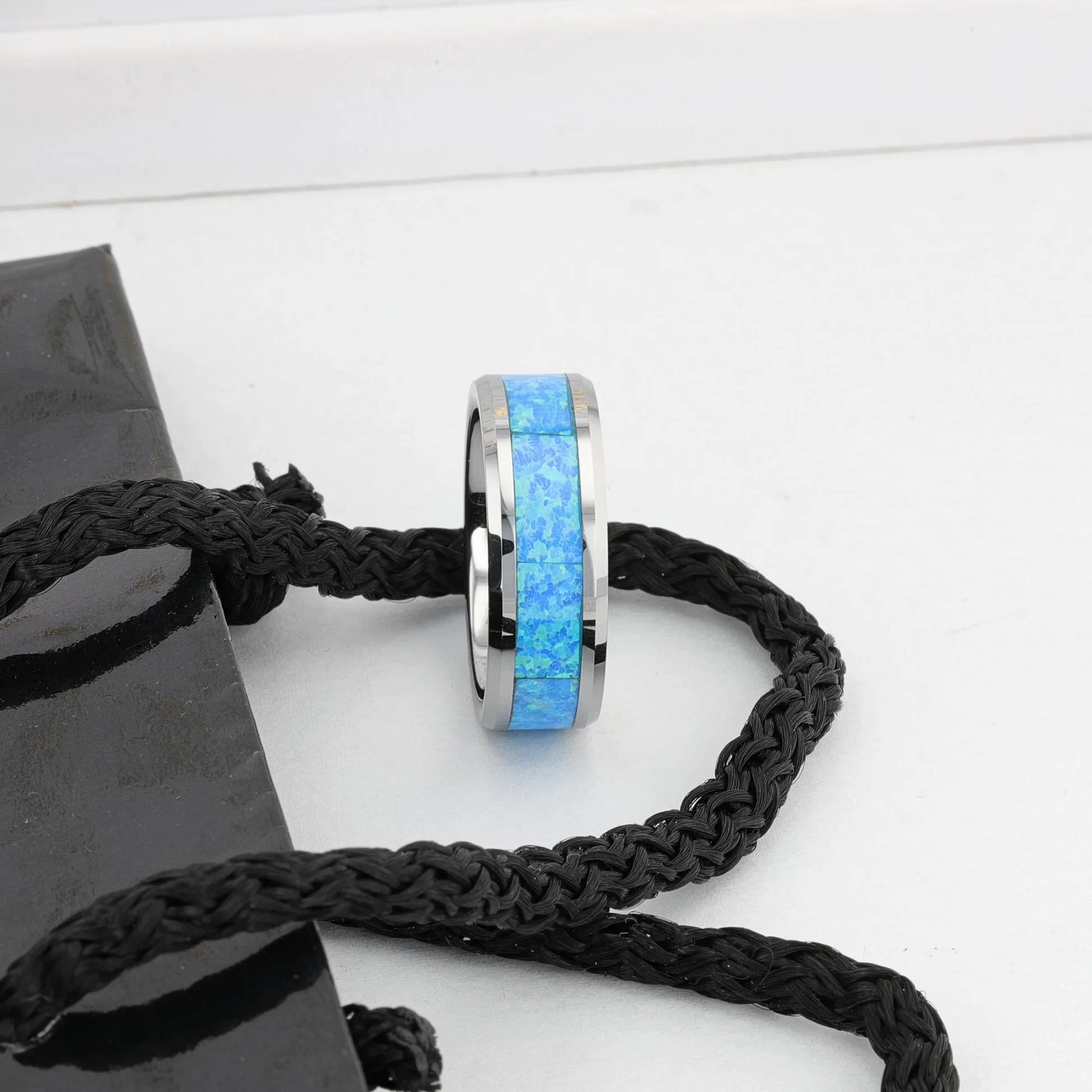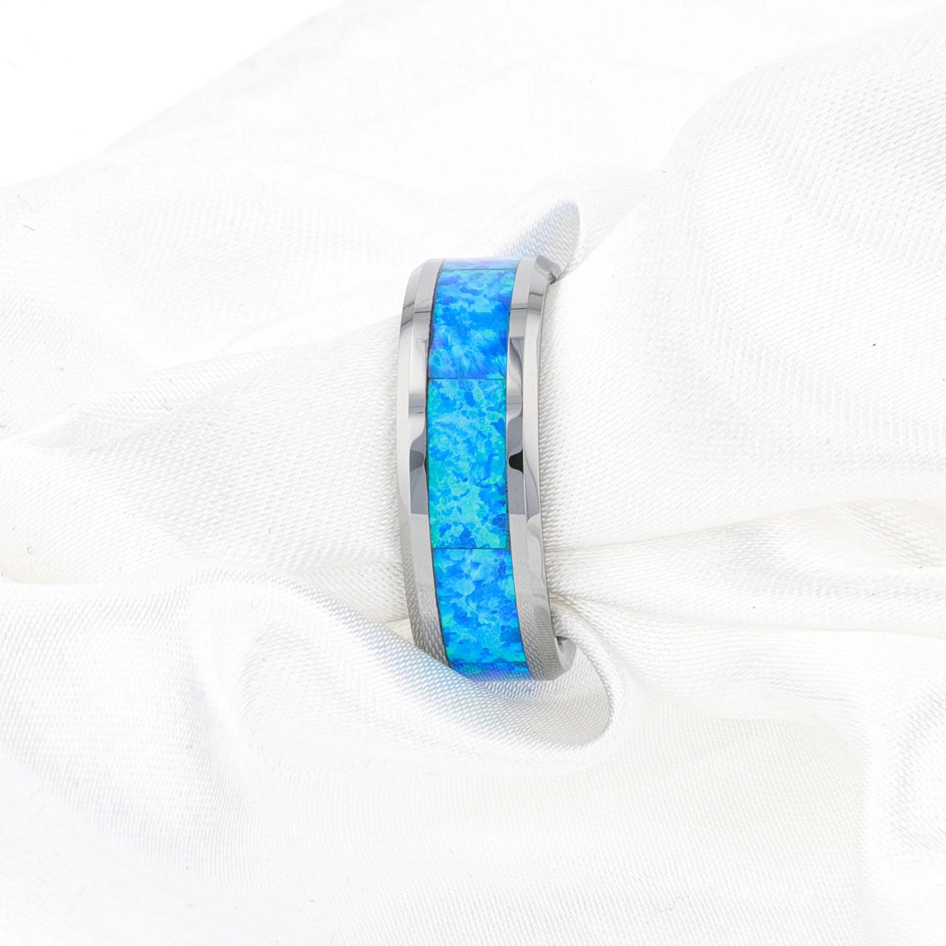This exotic and finely polished Tungsten Carbide ring by Thorsten features an inlay of sparkling laboratory grown blue/green opal.