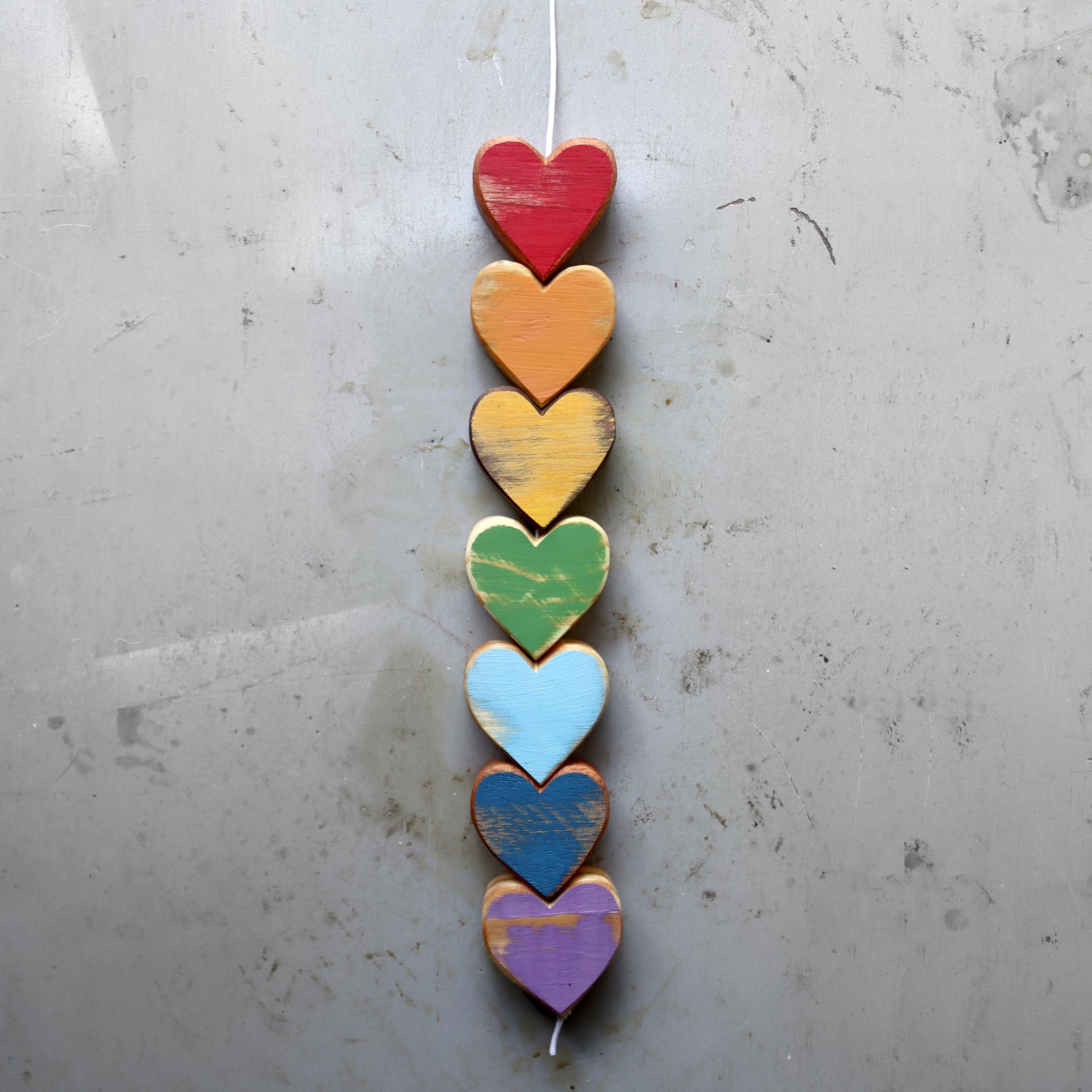 Our Reclaimed Wood Rainbow Heartstrings include seven colorful, connected hearts painted with bright rainbow colors and distressed to show off the reclaimed wood beneath. The hearts are connected with a sturdy white cloth cord tied with a loop for easy wall hanging.