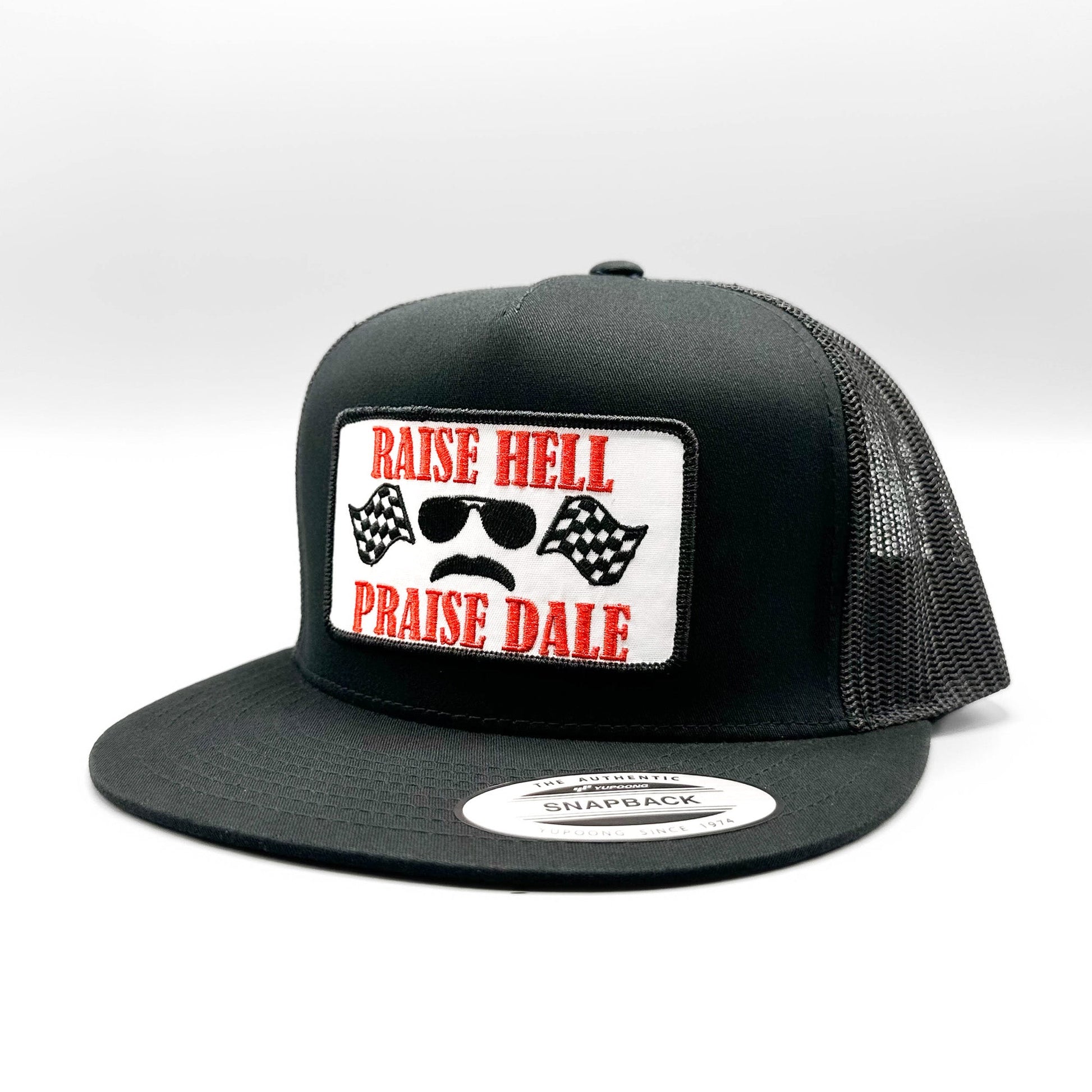 This Nascar trucker hat features a retro red and black "Raise Hell Praise Dale" embroidered patch on an all black, premium Yupoong 6006 Classic high-crown mesh snapback baseball cap.