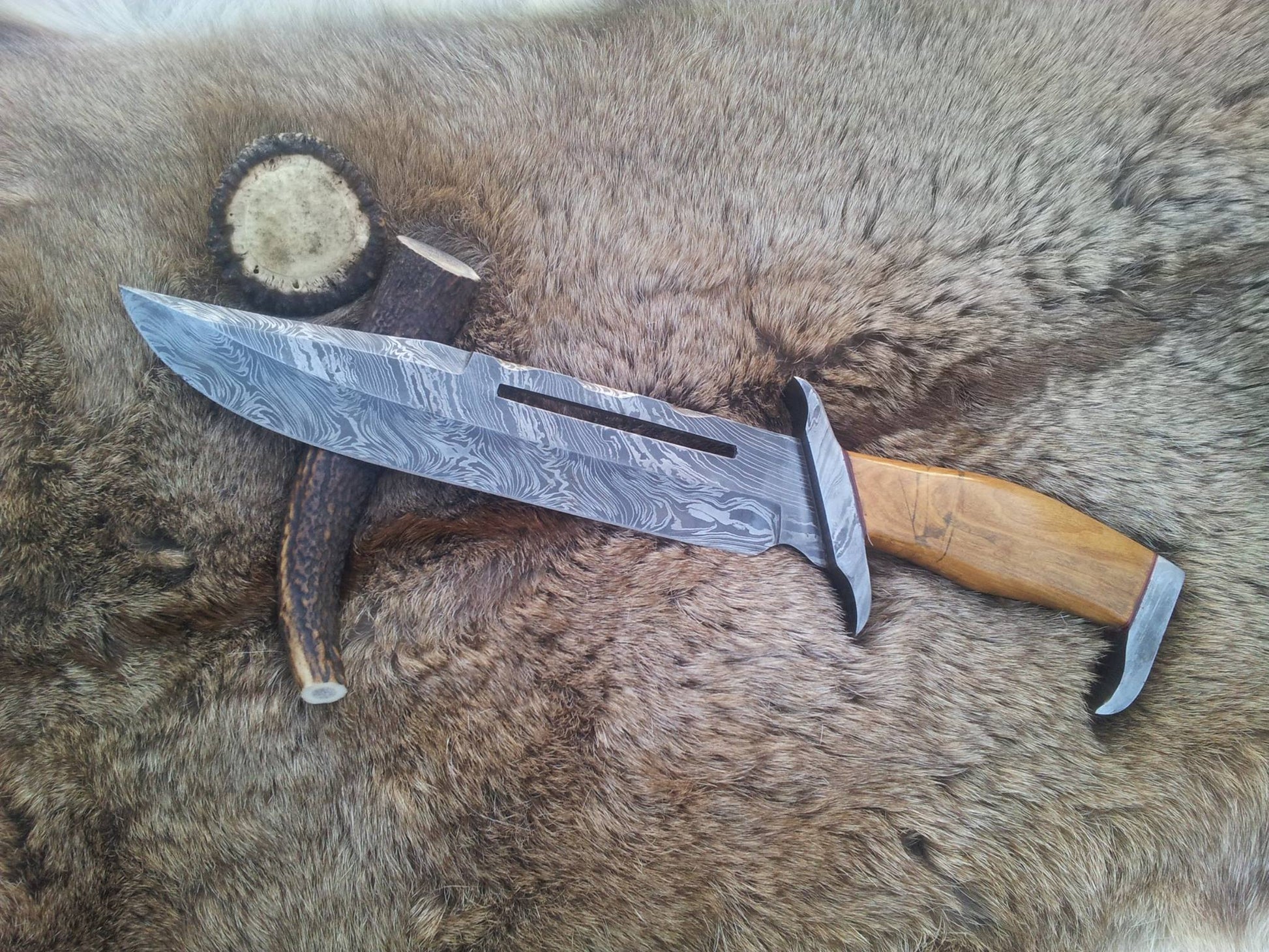 Rambo Knife for Sale - Custom Handmade Damascus Bowie with Olivewood Handle