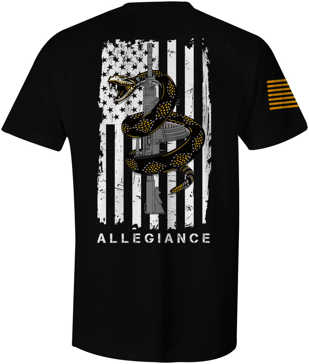 Unleash your patriotic spirit with the Allegiance Rattler Tee. This striking tee features a powerful graphic of a rattlesnake coiled around a rifle, set against a distressed American flag backdrop. The word "Allegiance" is boldly printed beneath the design, symbolizing strength and resilience. The design is showcased prominently on the back, with a smaller version on the front, and an American flag on the sleeve. Crafted from 100% cotton, the Rattler Tee offers a comfortable and durable fit, perfect for any occasion, whether you're hitting the range or just want to make a statement. Designed and printed in the USA.
