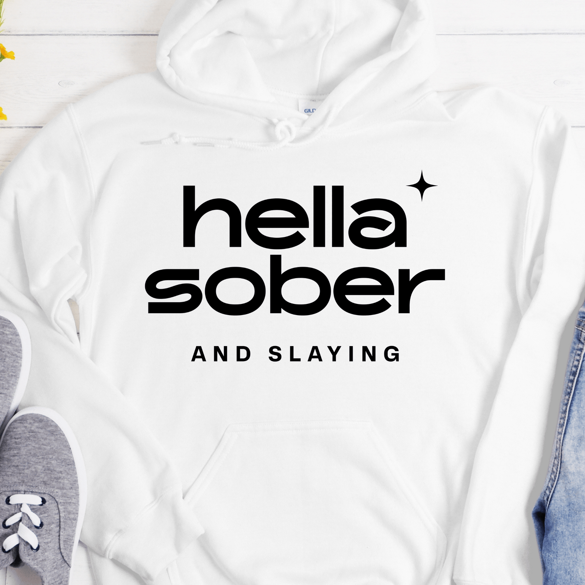 Join the recovery revolution with our inspiring Sobriety hoodie! With its bold slogan, "Hella Sober & Slaying," this hoodie is perfect for those who refuse to take themselves too seriously. Stay warm and make a statement with this quirky and fun hoodie. Now that's something to be sober and slaying about!
