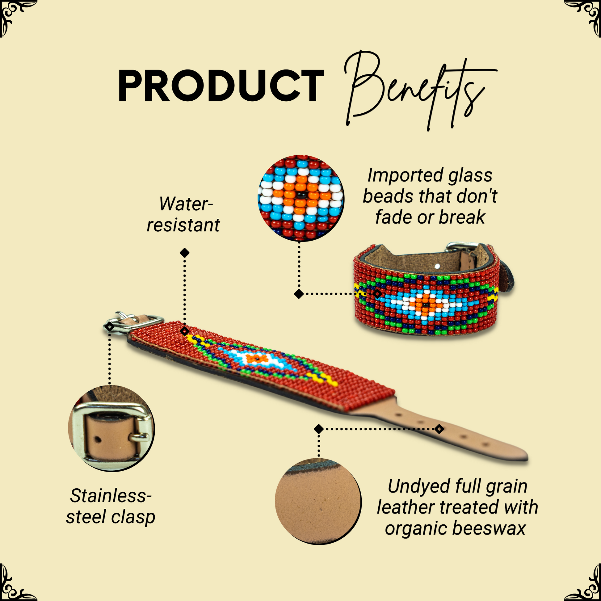 This incredible beaded bracelet from Sambboho is the perfect addition to your jewelry box. Fully handmade by female artists in Brazil. Premium leather bracelet made with world renown Slovakian glass beads. Our leather is un-dyed, full grain, and treated with organic beeswax for water resistance. Western, bohemian and native inspired designs with vibrant colors. Sustainable shopping! Your purchase allows these women to be financially independent and safe. Thank you for making a difference in their lives. This bracelet matches with the dog collar, hatband and belt from the same collection! Hypo allergenic stainless-steel closing. Flexible leather, very comfortable to wear for an extended period of time! As always, your purchase comes with a 30-days return policy and a 1-year warranty. Fast free shipping from the US.
