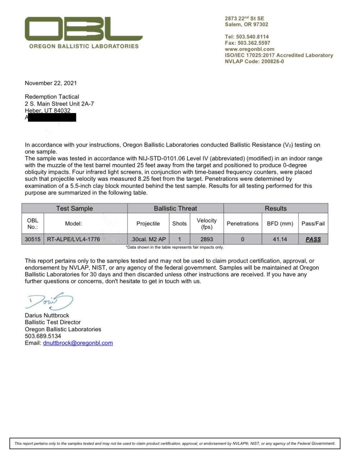 Our armor is independently tested and certified to NIJ 0101.06 standards by Oregon Ballistics Lab, which is an NIJ-approved testing facility accredited by NVLAP and A2LA to ISO 17025.