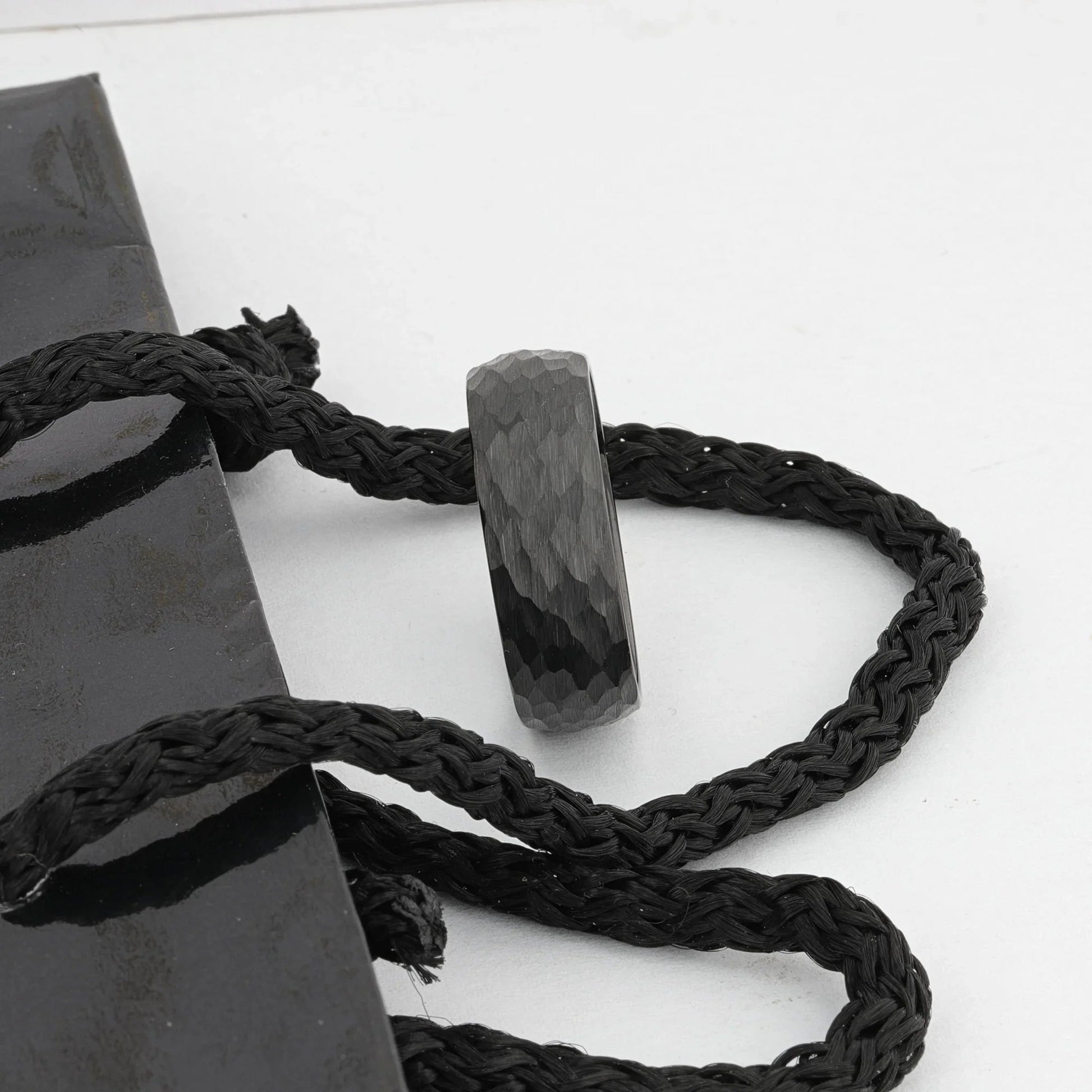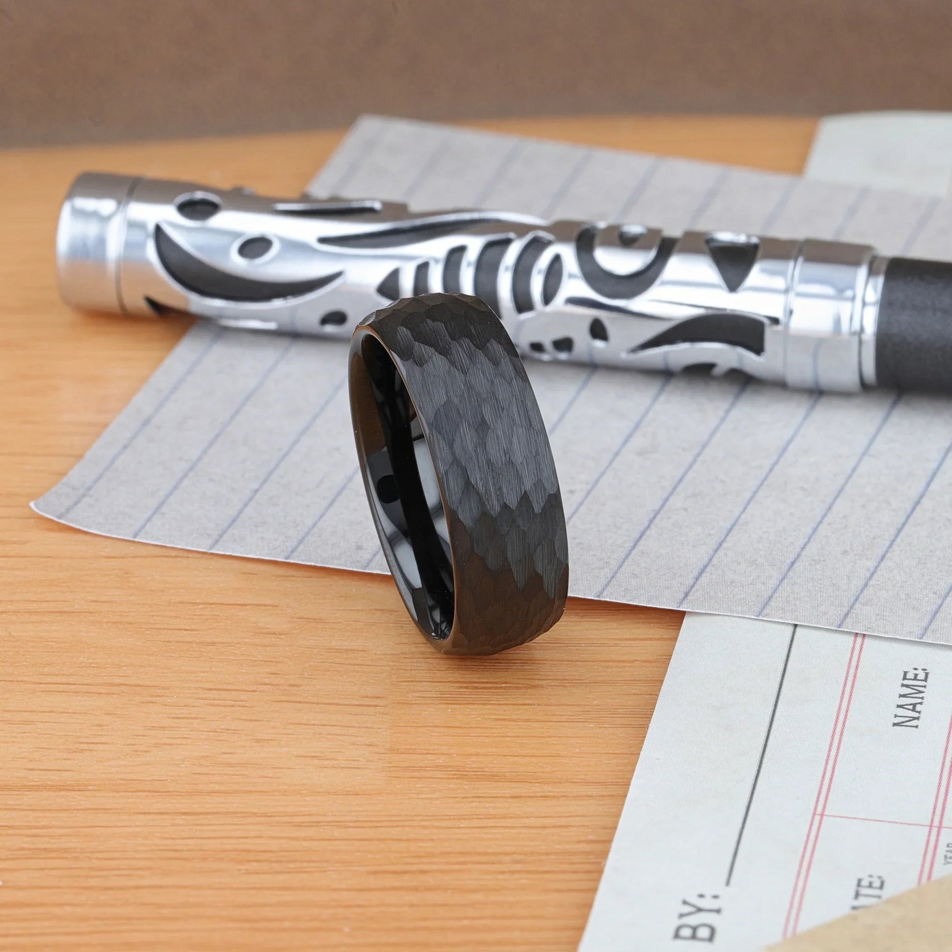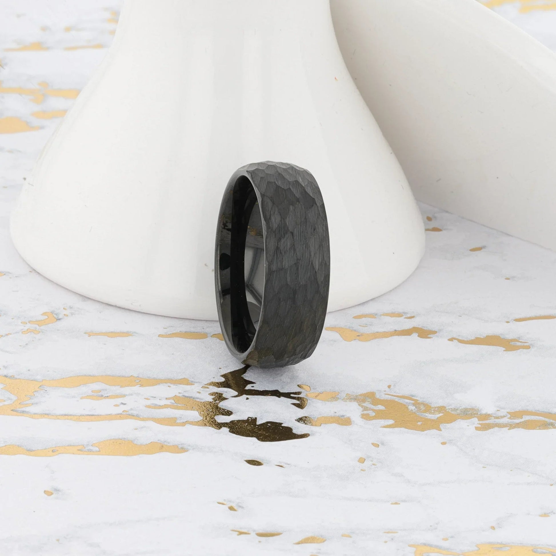 RENEGADE Domed Hammer Finish Black Tungsten Carbide Wedding Band with Brushed Finish - 6mm or 8mm This heavy-duty and hammered finish of this Thorsten-designed dark and sexy Black Tungsten Carbide wedding band makes a bold statement about the strength of your love and can be worn as a wedding band or promise ring by men or women.