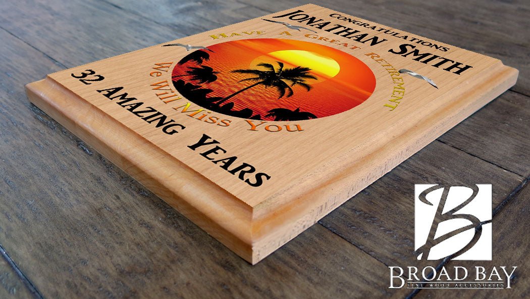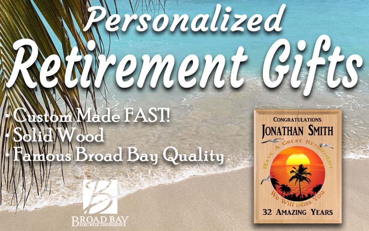 This unique, personalized Retirement Gift plaque is the perfect customized retirement gift idea for a man or a woman! Carefully crafted from solid maple wood, this great, custom made retirement plaque will be cherished for years to come. The customized artwork is carefully applied to the wood in a unique process developed by Broad Bay to allow the beauty of the solid maple wood to show through the design. This top quality, solid maple retirement gift plaque is perfect on the mantel, or hanging anywhere in the home or office. The perfect gift for a retired coworker - men or women!